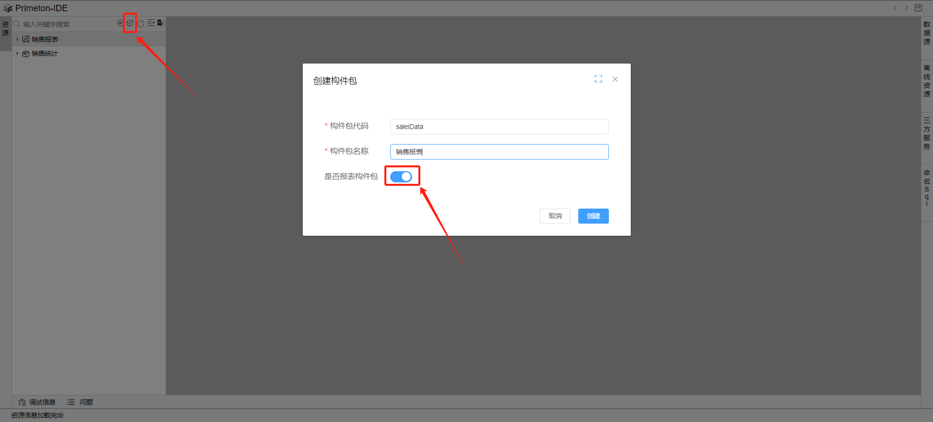 点击开发,新建构建包,勾选是否报表构建包。