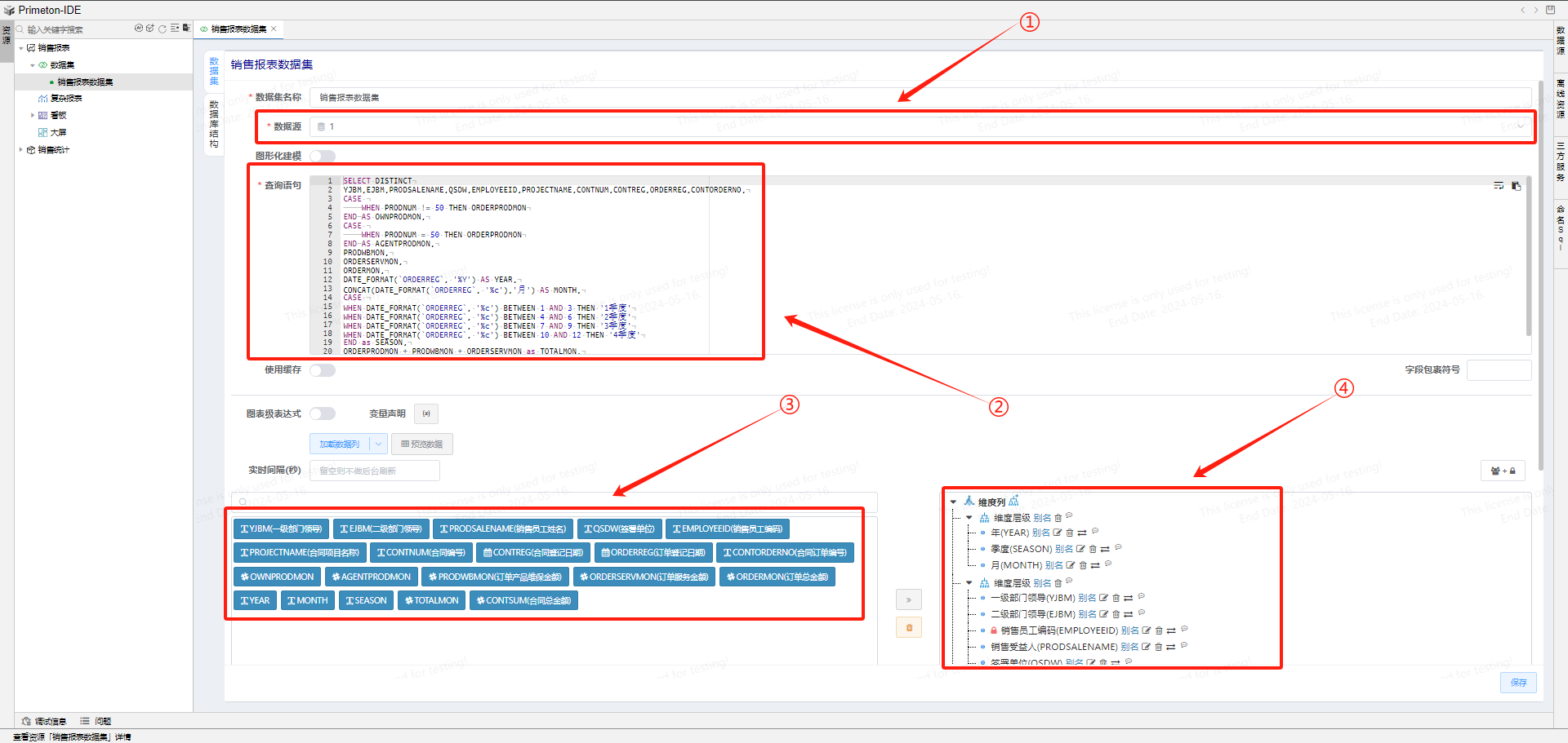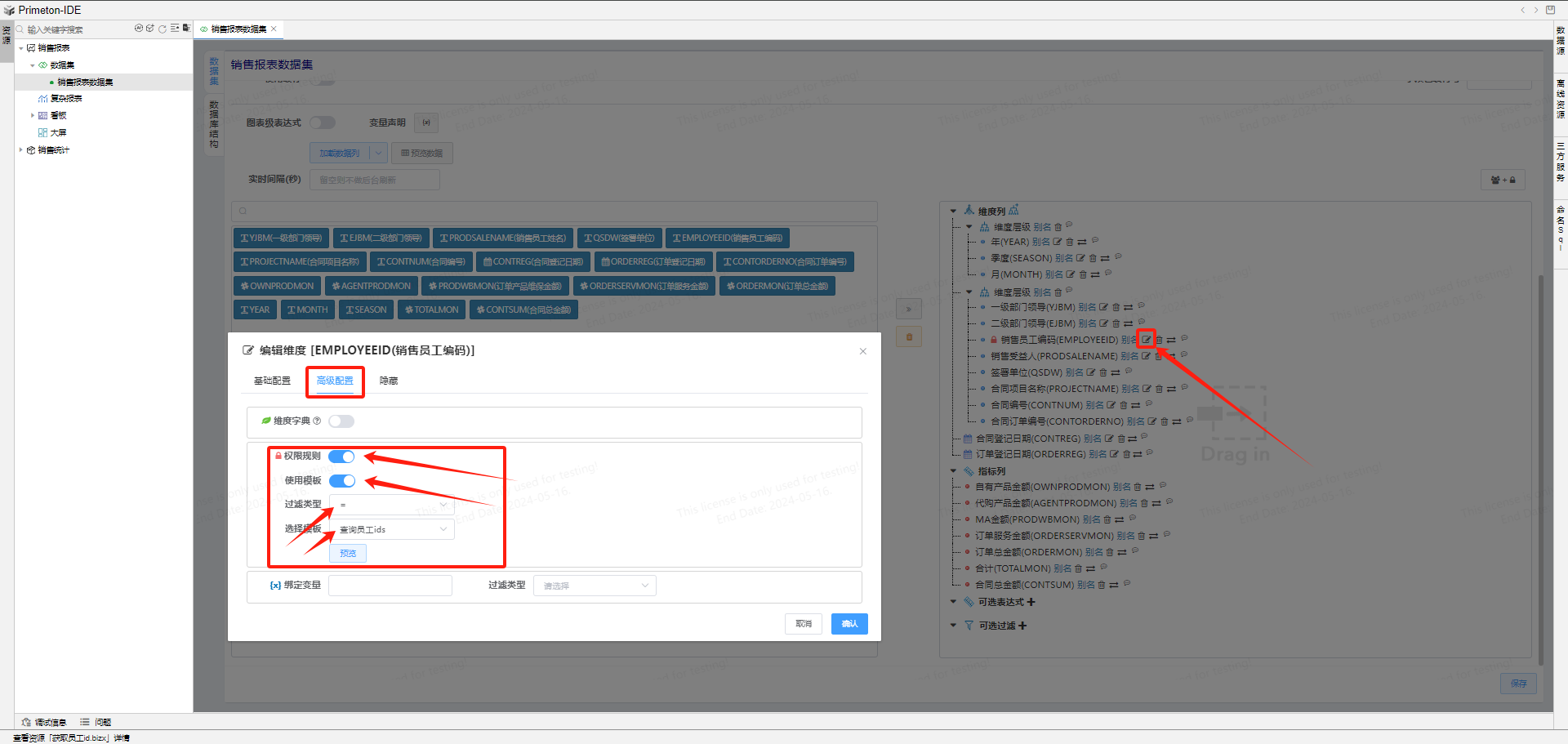 回到低开-销售报表构建包-数据集,点击配置销售人员编码维度列,高级配置中,勾选权限规则,选择刚才创建的查询模板。