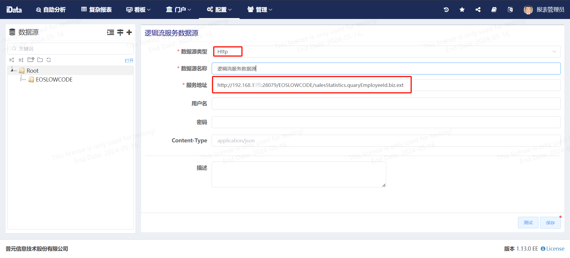 登录创建的报表管理员账号idataadmin,配置-数据源管理,新建http数据源并保存。