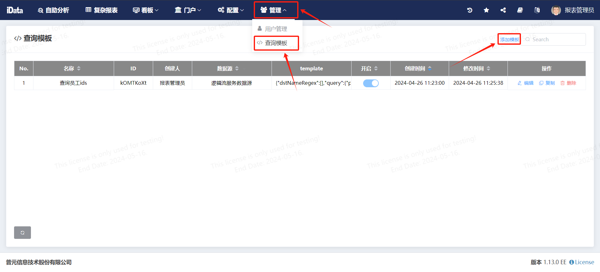 点击管理-查询模板,添加模板。