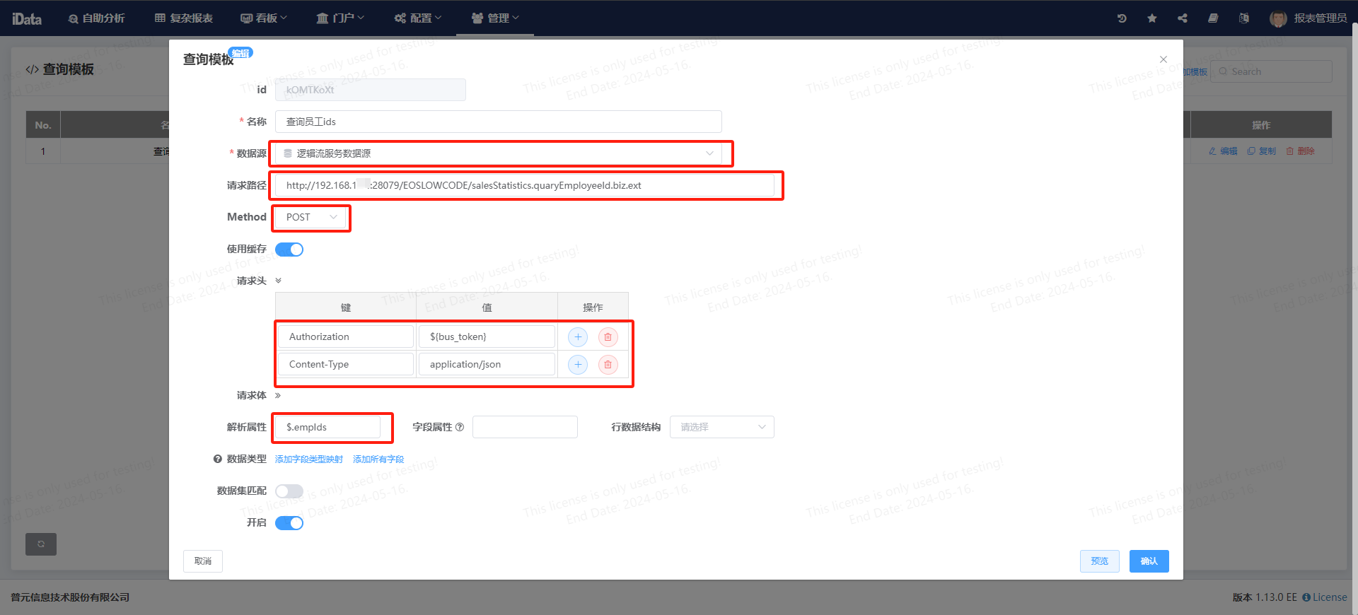 4.在iData平台中,创建http服务数据源,并新建查询模板,调用逻辑流服务。