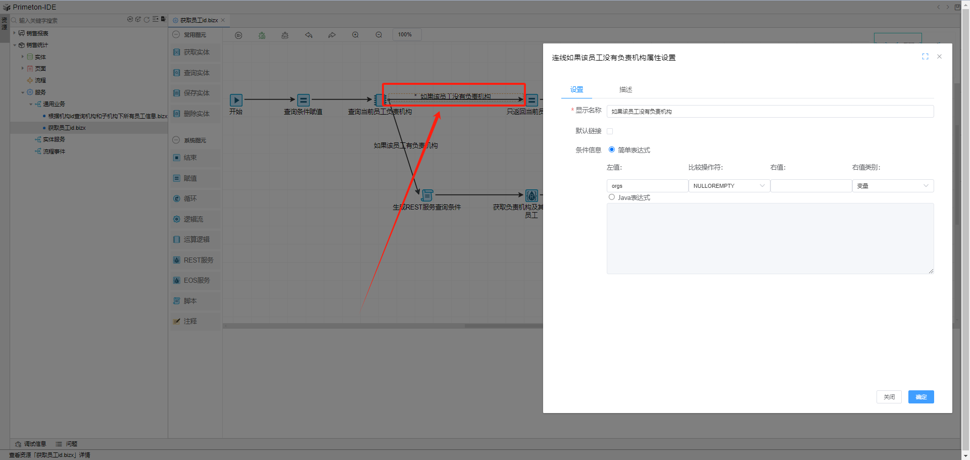 添加一个赋值图元与查询实体图元连线,双击连线添加条件:左值:orgs,比较操作符:NULLOREMPTY。