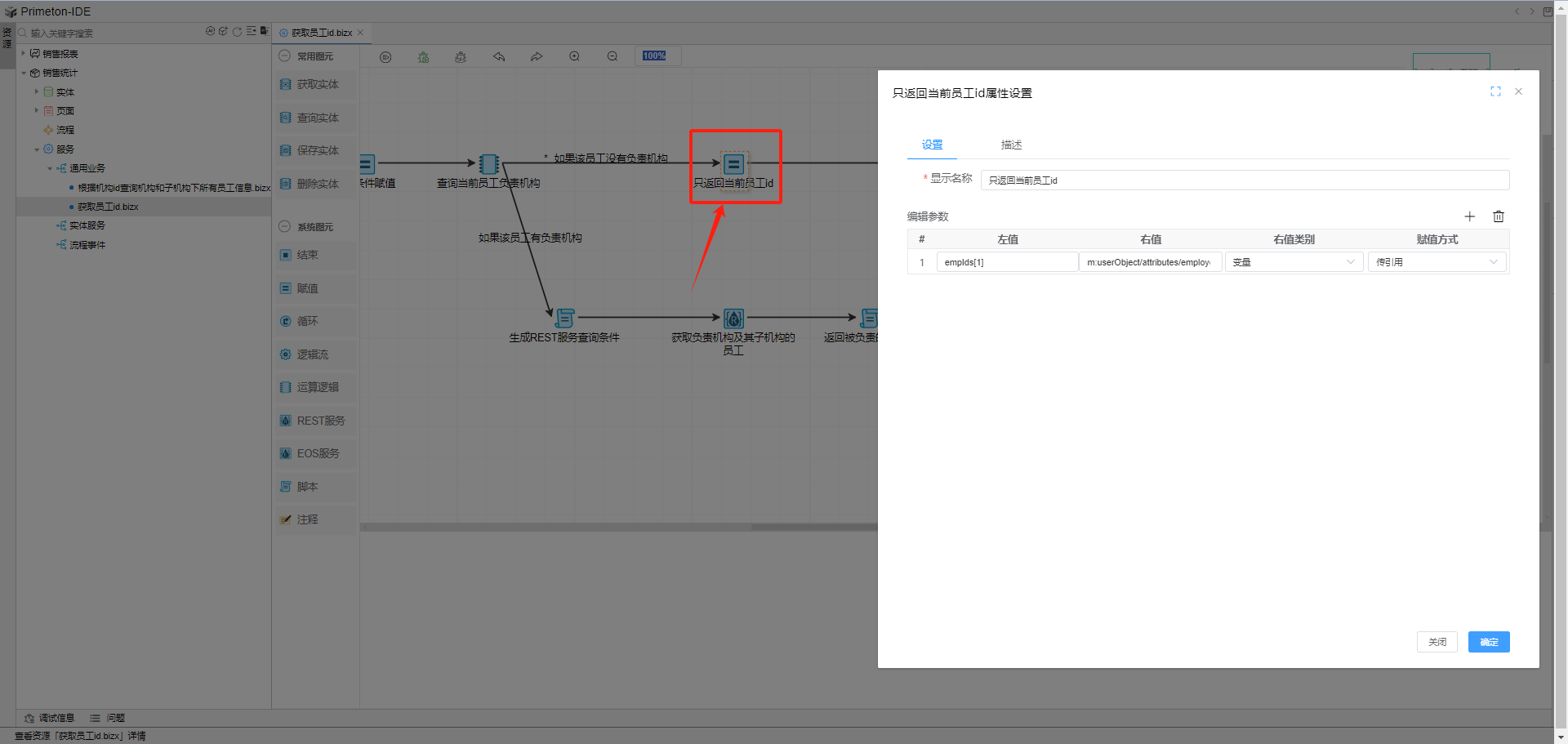 双击赋值图元,把当前登录用户id直接赋值给返回值empIds[1]对象,左值:empIds[1],右值:m:userObject/attributes/employeeId。
