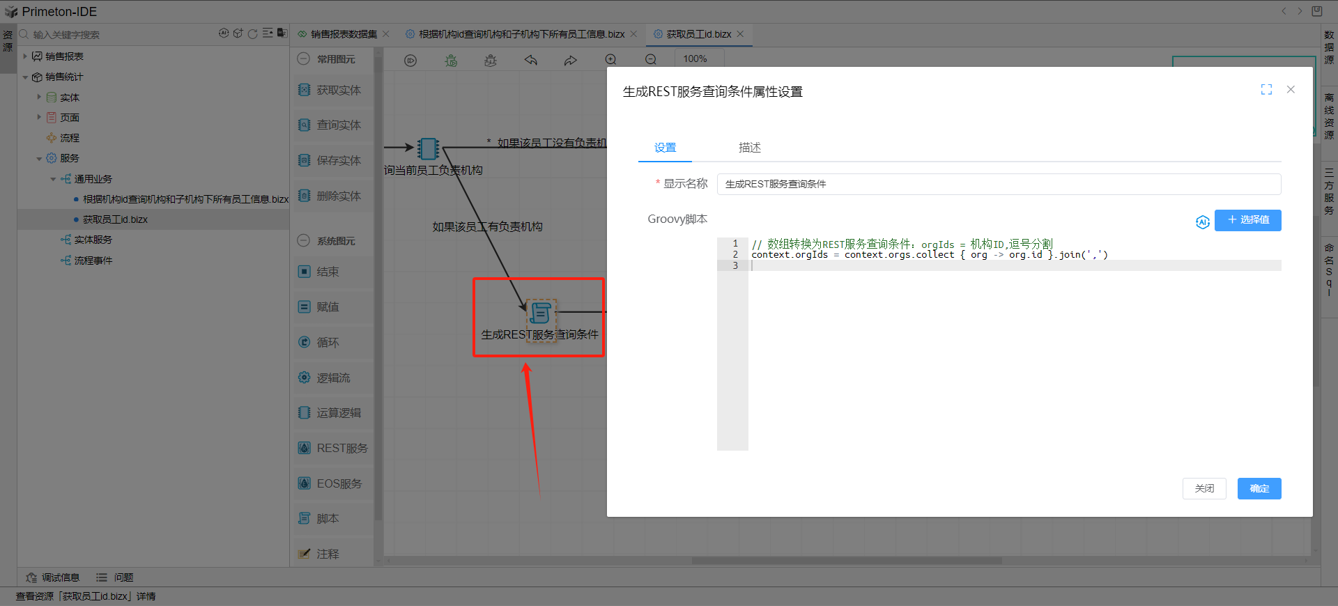 添加脚本图元,生成REST服务所需要的orgIds参数类型和格式,赋值变量orgIds:机构id查询条件。