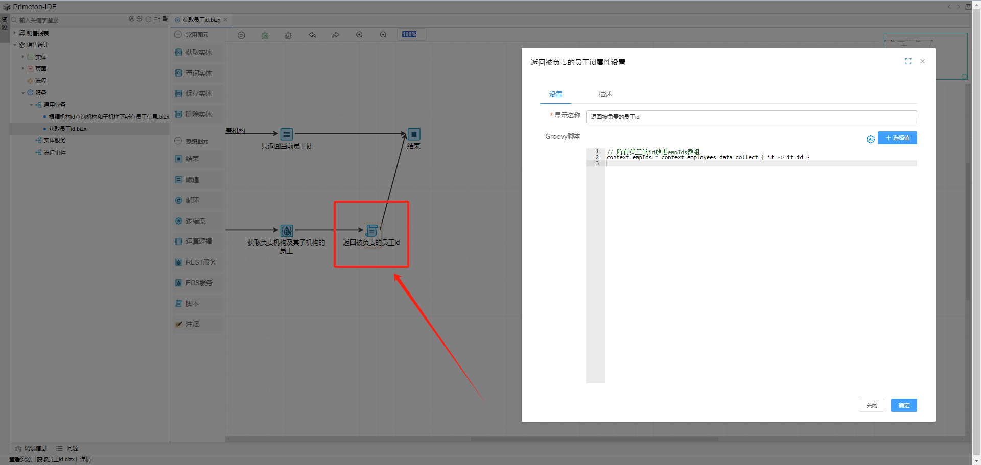 添加脚本图元,从employees.data集合中,拿取所有的员工id放进最后返回值empIds中。