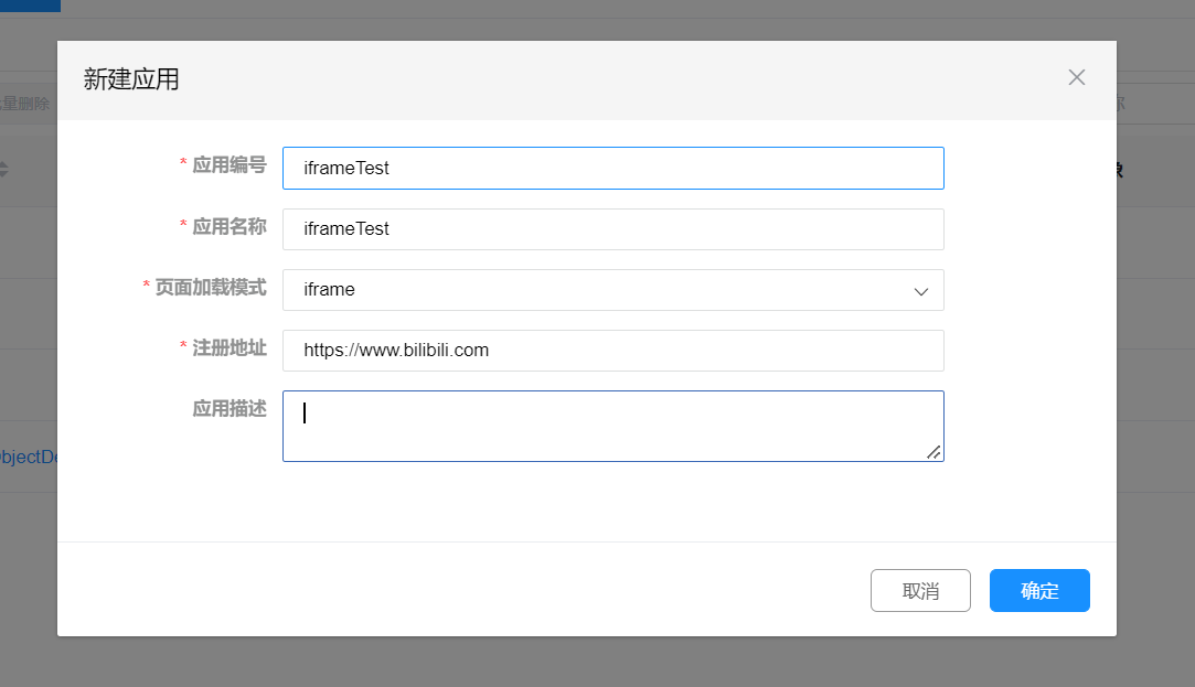 1、新建应用,页面加载模式选择'iframe',其中注册地址为其他项目的地址