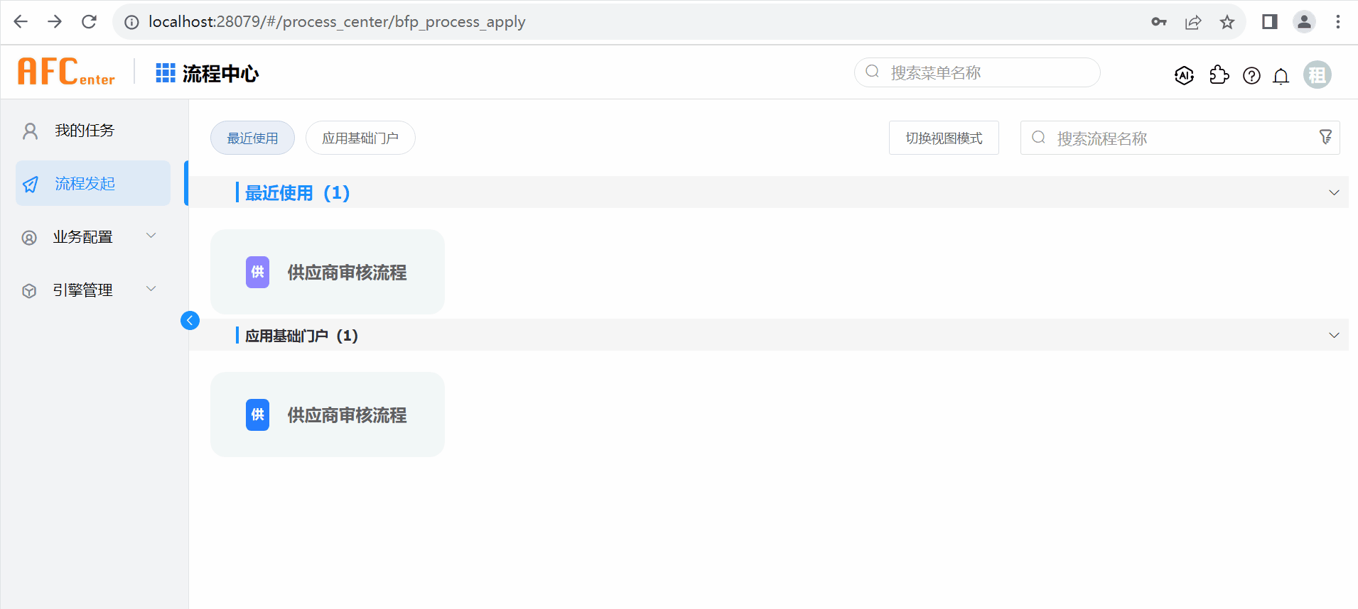 进入AFCenter的工作流程页面,进入流程发起菜单,发起供应商审核流程。