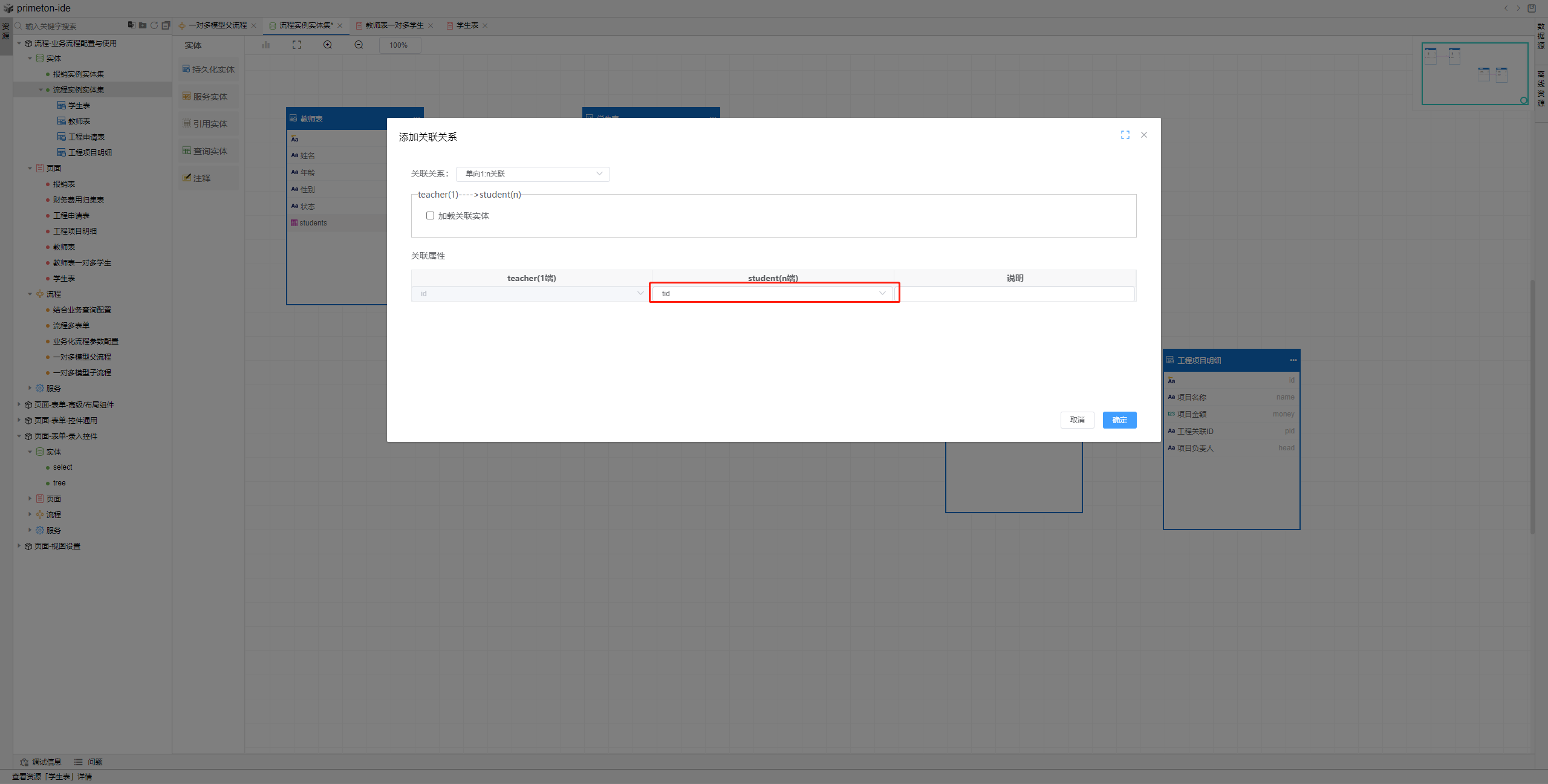 3.根据数据实体创建父流程表单页面,1端作为主流程页面,需要拖选子表格组件,绑定n端默认视图,子表格绑定数据实体n端字段,编辑模式选择弹窗,保存主流程。