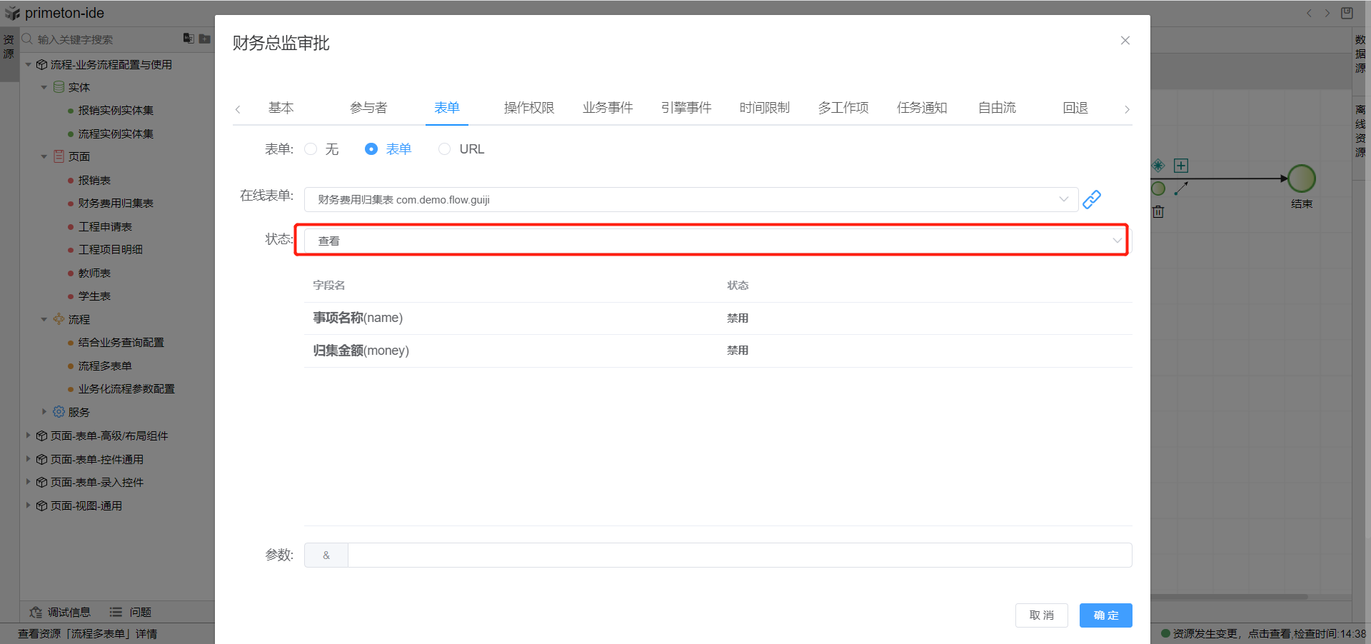 3.财务审核与财务总监审批环节图元只需配置报销表单与财务归集表单的查看状态即可完成流程多表单配置。