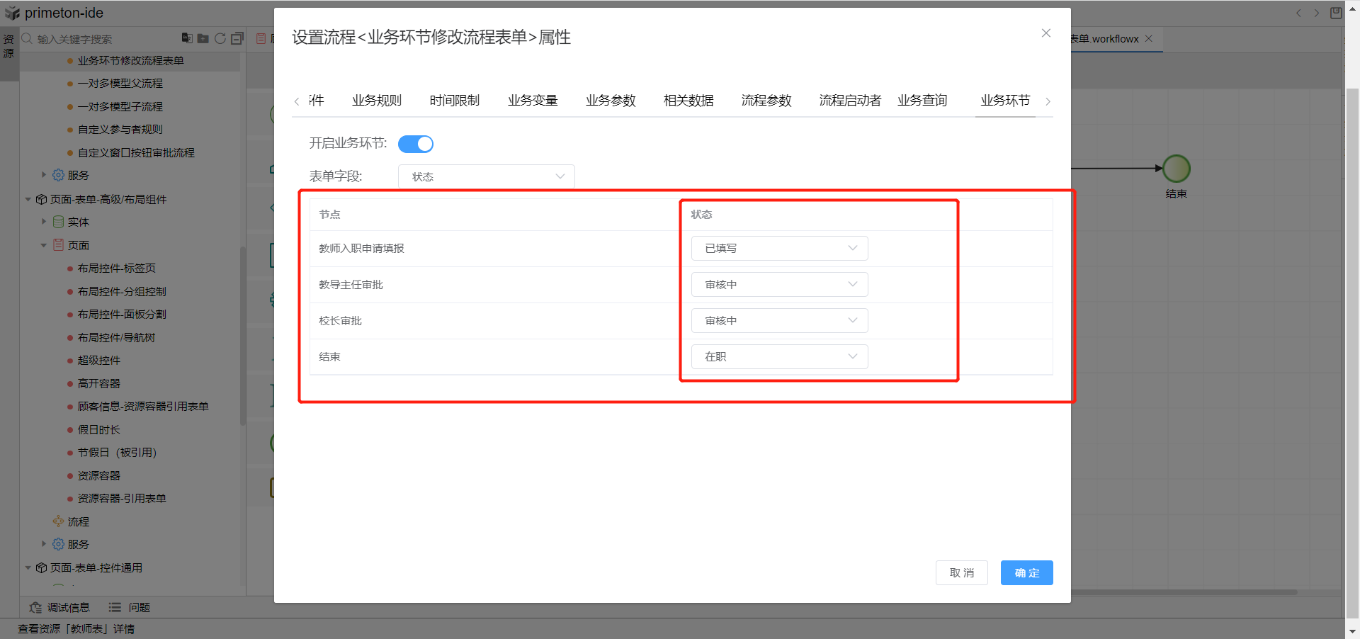3.下方每个节点可以选配业务字典的值,配置完成后,保存流程,提交相应节点就可以按照节点配置修改教师状态的值。