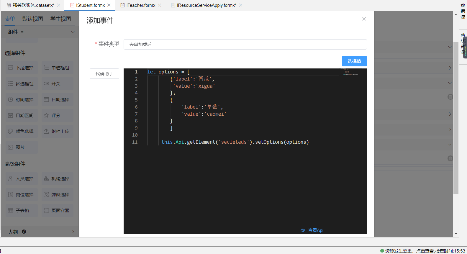 也可在表单的js事件中使用API为选择组件设置options值,如下: