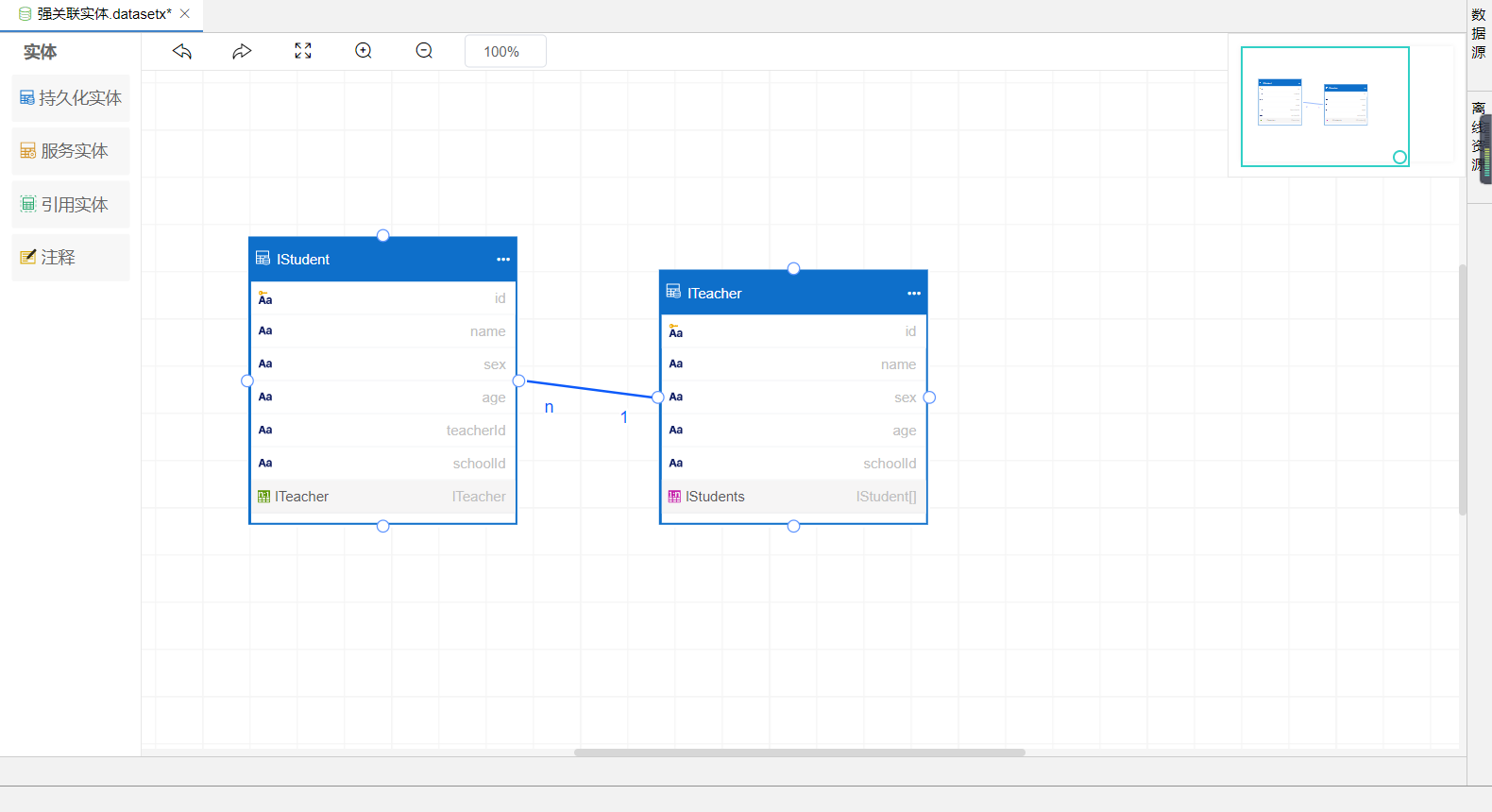 如上图所示:ITeacher与IStudent建立双向一对n强关联关系,建立持久化实体ITeacher、IStudent的表单,在ITeacher表单中拖进子表格控件,绑定IStudent的视图,即可在ITeacher表单中添加IStudent实体数据,通过关联关系将数据提交至数据库。