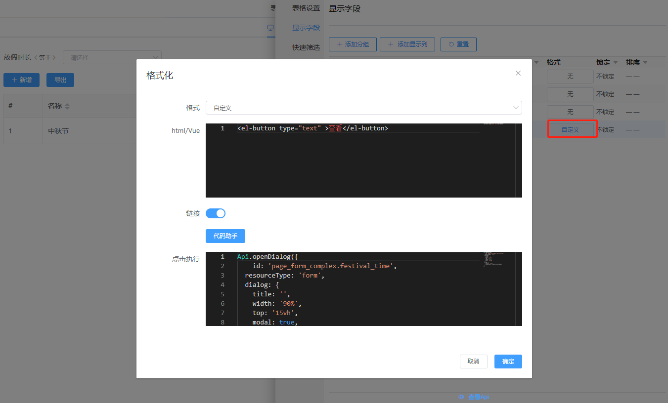 表单或视图按钮上可绑定弹出窗口事件,在打开弹窗中可进行参数传递。