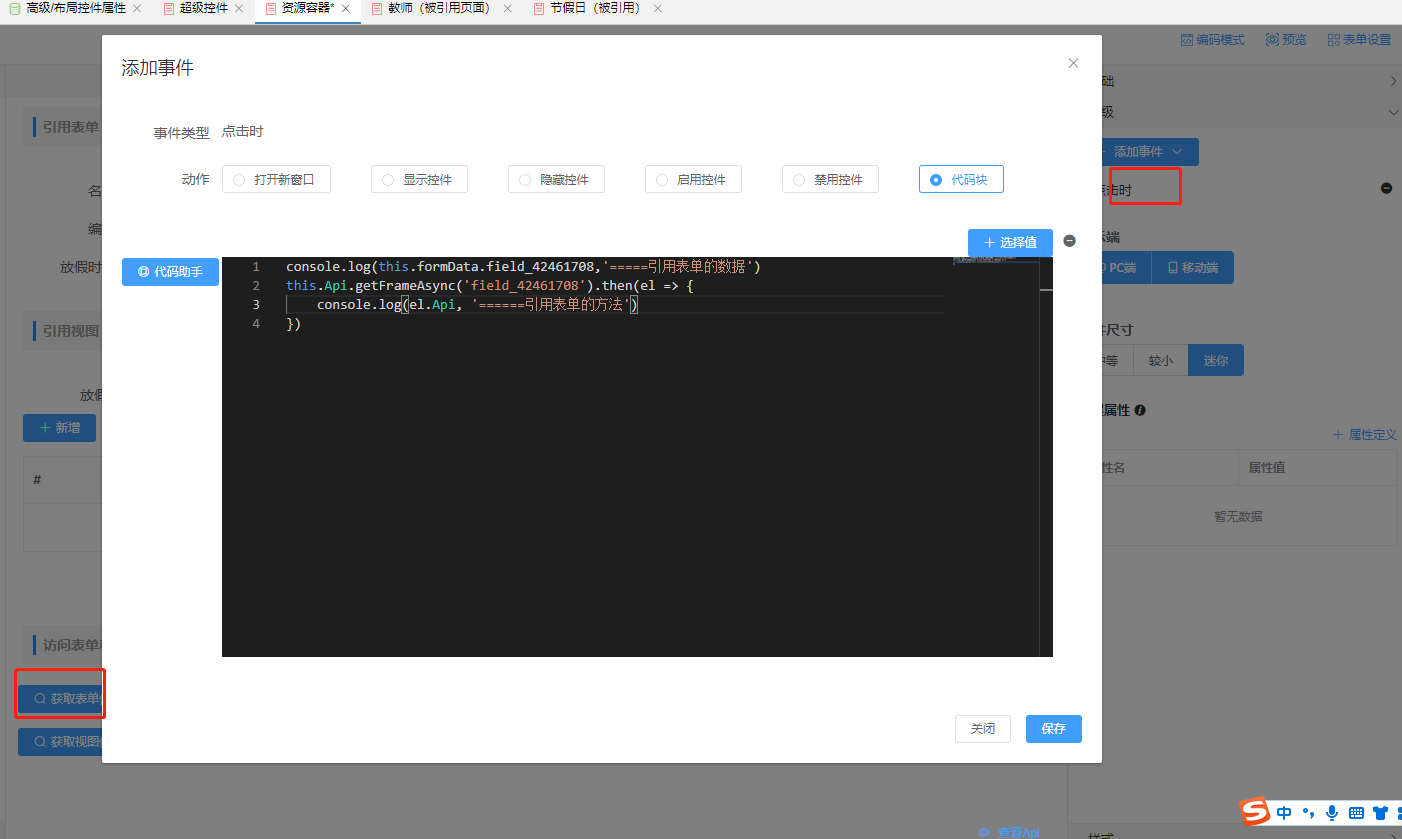 3.编写视图查询js脚本。当前场景是表单加载后默认展示第一个标签页的视图数据,所以在表单高级设置中创建表单加载后事件,调用getFrame('页面容器组件编码')方法拿到容器组件属性在调用他的doQuery方法,达到默认加载页面查询数据的目的;