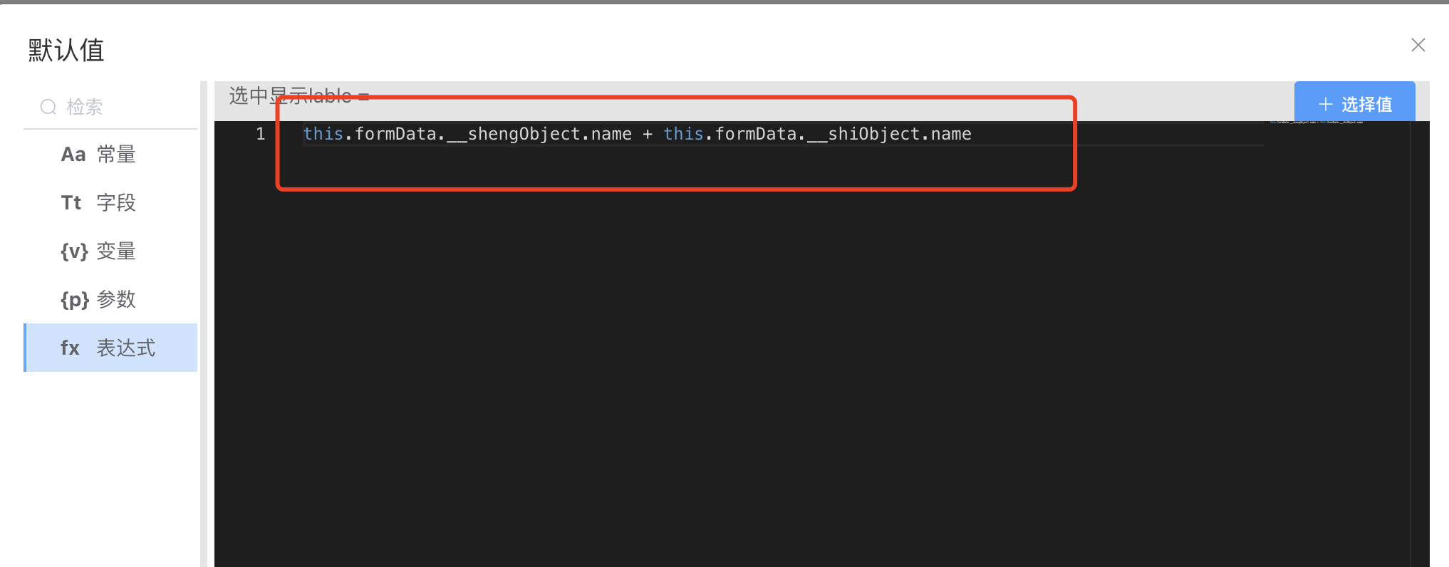 选择组件的数据来源可以选择为自定义数据绑定选择组件,自定义的数据通常在表单高级设置中设置变量,变量格式固定,如下