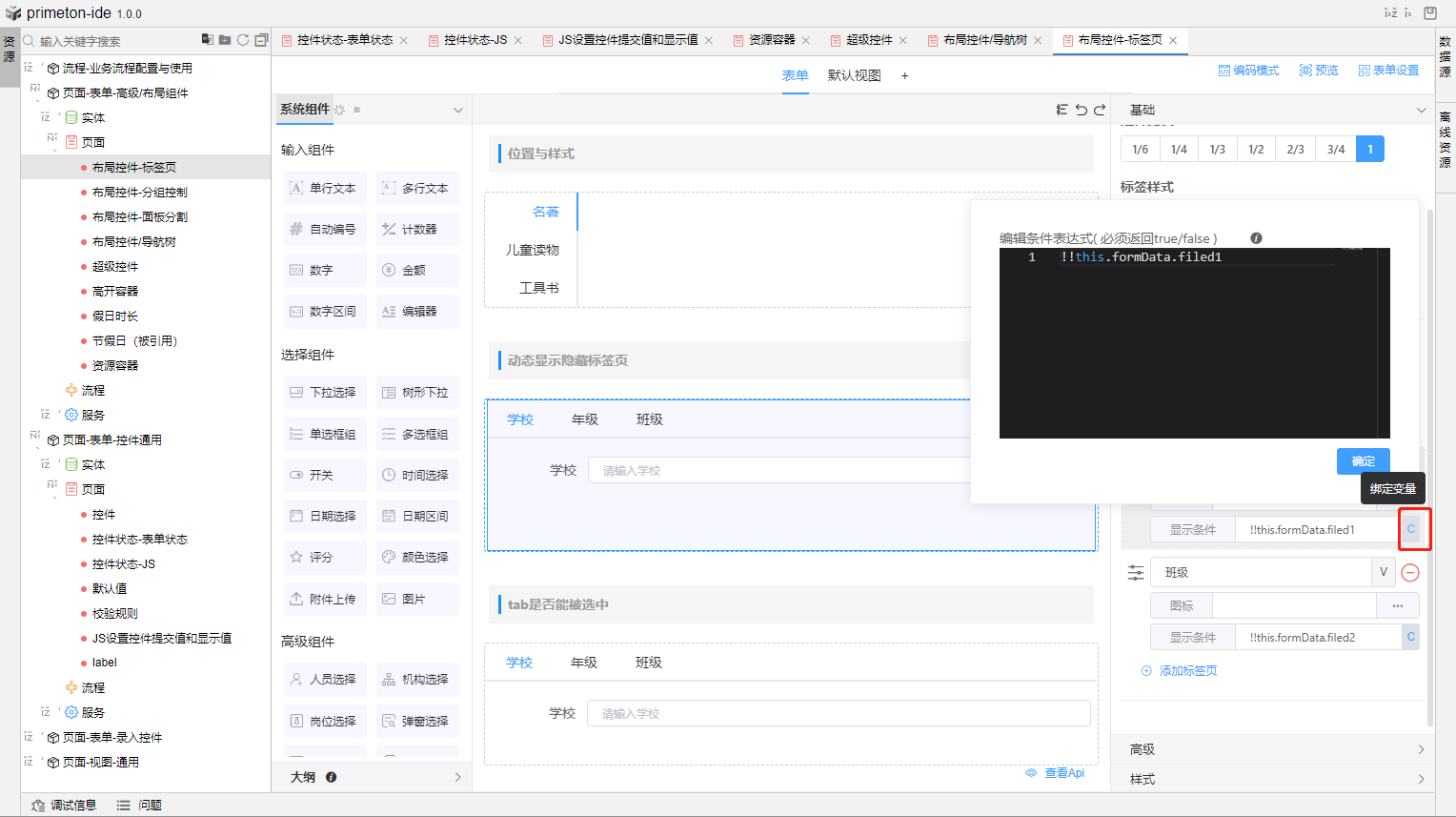 3.也可使用布局组件标签页进行控制标签页内的组件的显示与隐藏,输入显示条件,即可根据返回值true/false来进行组件的显示与隐藏。