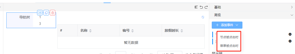 在高级里添加事件(节点被点击时),选择代码块,可以获取到当前点击节点的数据node