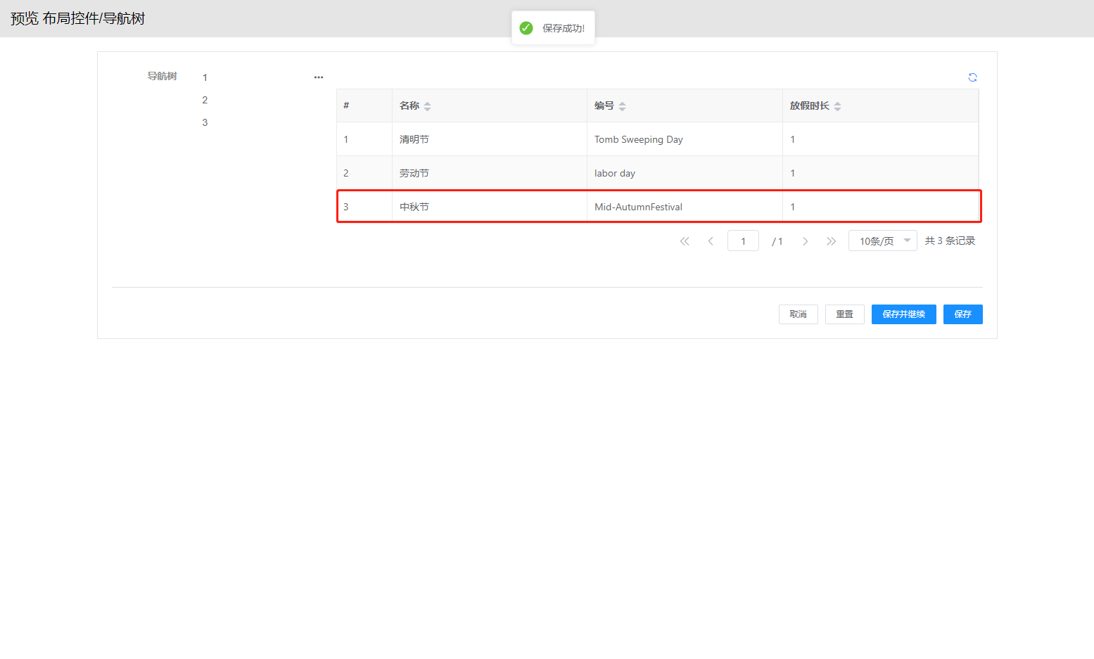 步骤1. 左侧导航树组件—动态数据选择<假日时长>实体,节点配置的基础配置-显示字段(time)和菜单配置添加action(add)