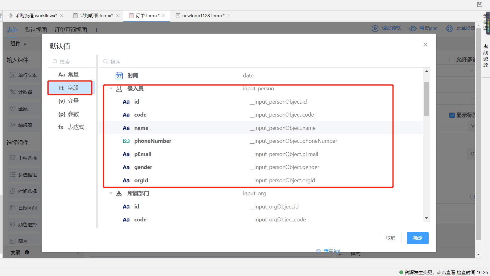 系统对象指当前表单内所生成的系统已有对象。例如当引入选人组件并绑定数据实体字段后,会生成人员Object实体,该实体中含有人员详细信息字段,以供后续赋值使用。机构组件、上传组件等在绑定完实体字段后都可生成系统对象