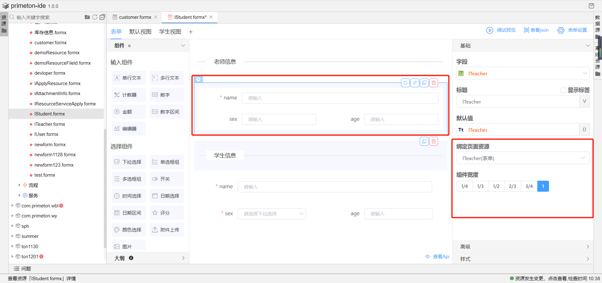 示例场景一:学生信息表单页面使用页面容器绑定教师信息表单资源,在查看学生详细信息时展示出该名学生班主任的信息(注:此时,教师与学生的实体模型关系为双向1:n,为页面容器绑定教师实体字段即可);