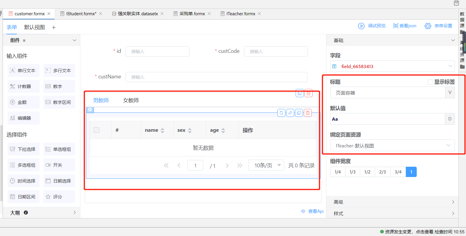 2.在主表单中拖进两个页面容器组件与一个标签页组件,两个页面容器分别绑定刚刚创建的男教师视图与女教师视图;在标签页组件基础属性中新增一个标签页,将两个标签页改名为男教师与女教师;分别将两个页面容器拖入对应标签页中。