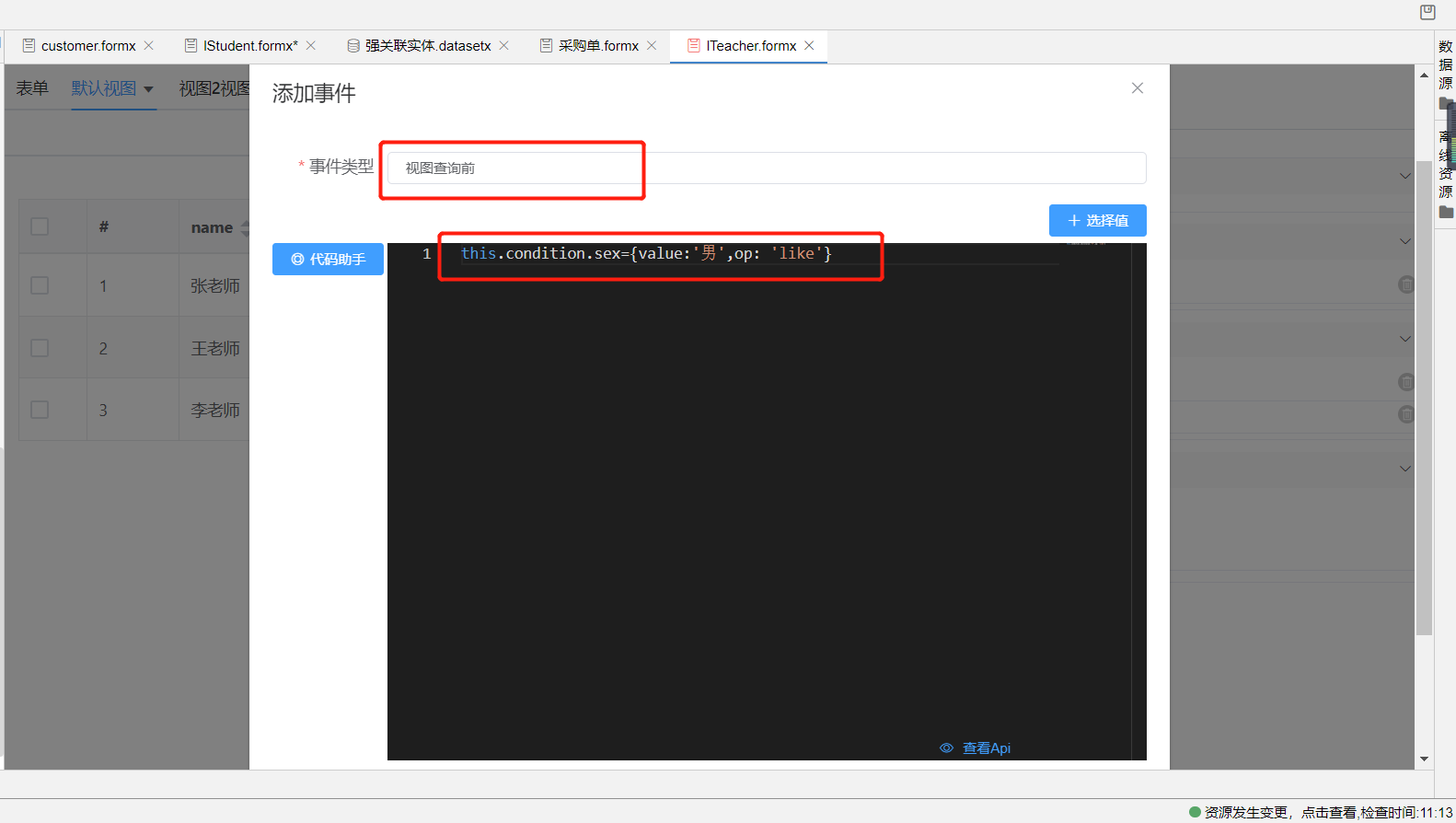 1.新增教师视图为女教师视图,将默认教师视图作为男教师视图,在男教师视图中找到视图设置=》高级设置=》新增视图查询前事件,编写视图默认查询条件根据性别值为男来查询数据的js代码如下: