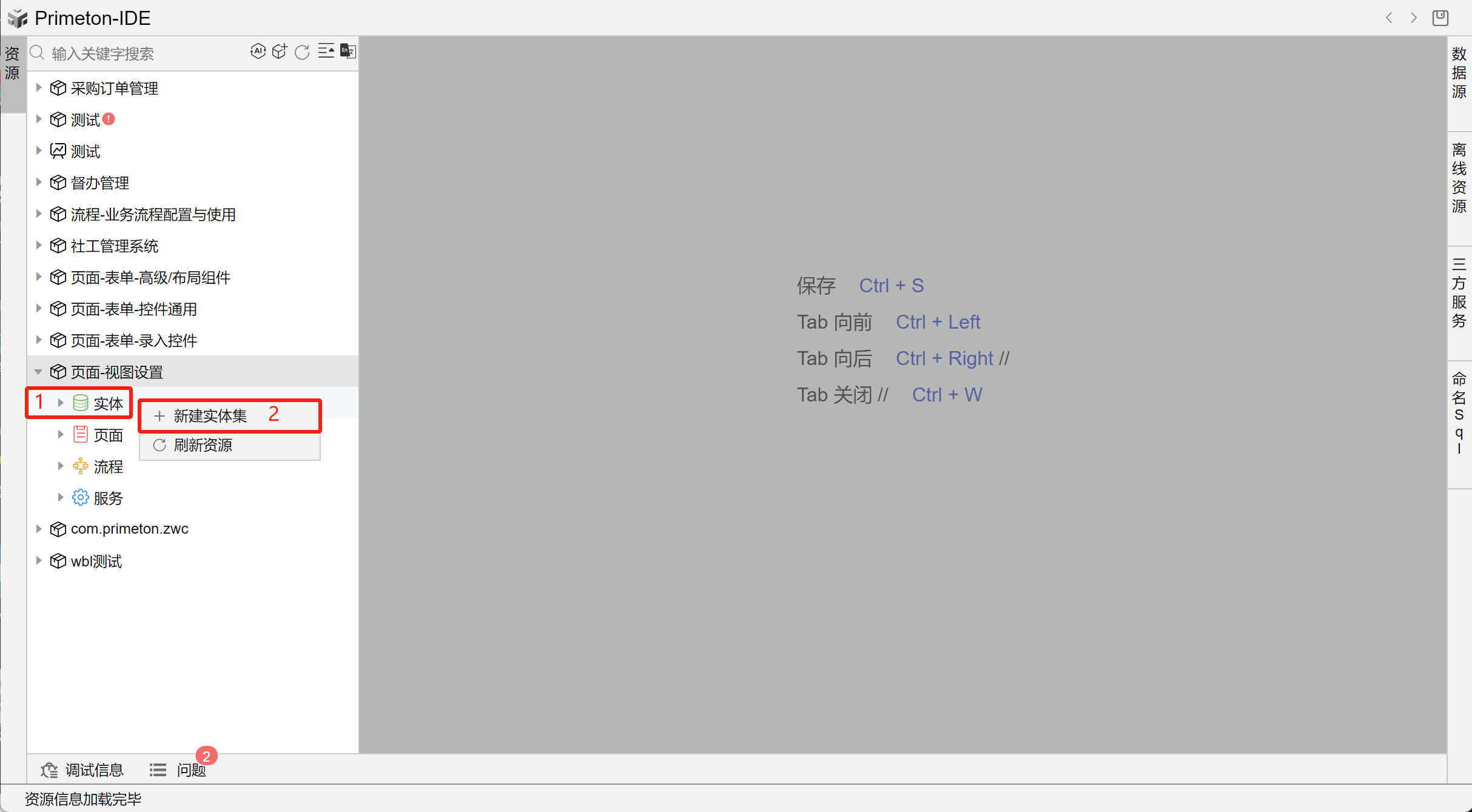 1 选择构建包的实体资源,右键,在下拉菜单中选择新建实体集。