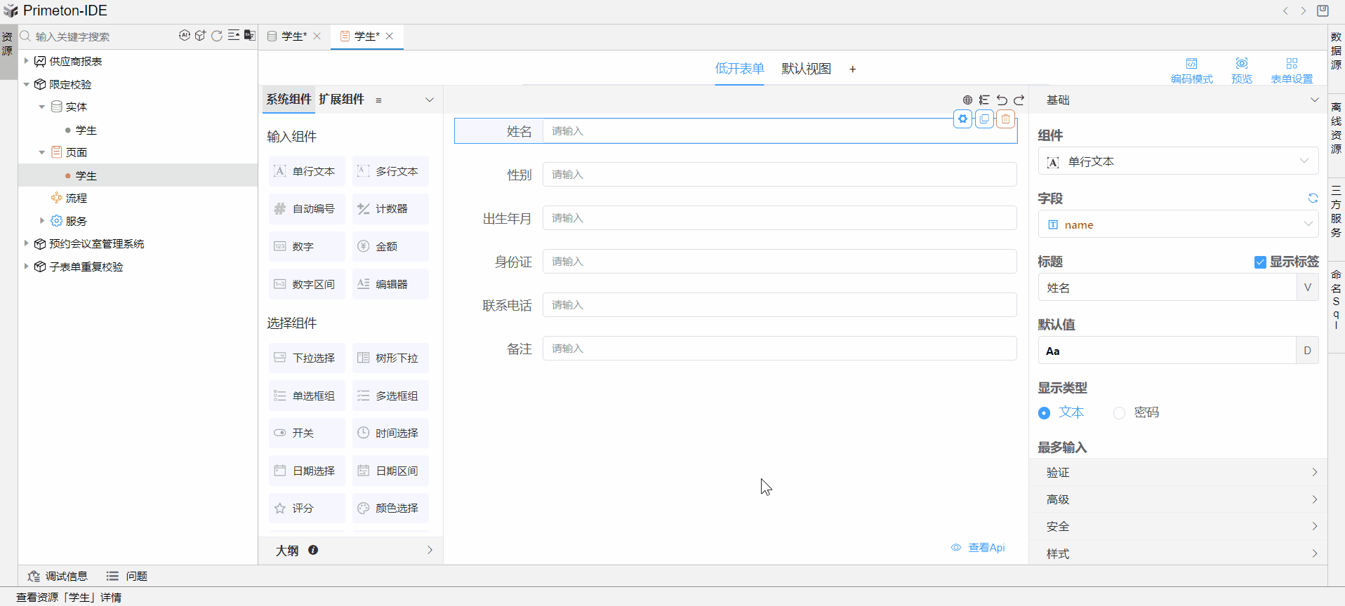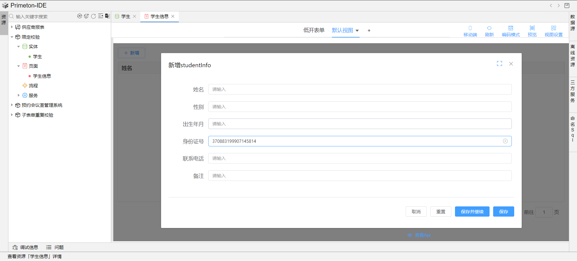 新建实体集,拖拽student_info表至页面,右键页面生成学生表单。