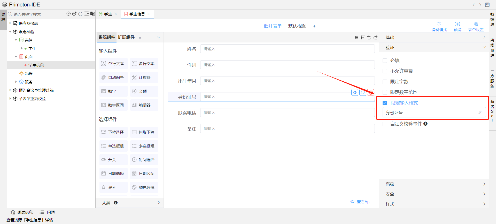 点击身份证号字段所在的单行文本组件,右侧校验-校验-限定输入格式-身份证号。