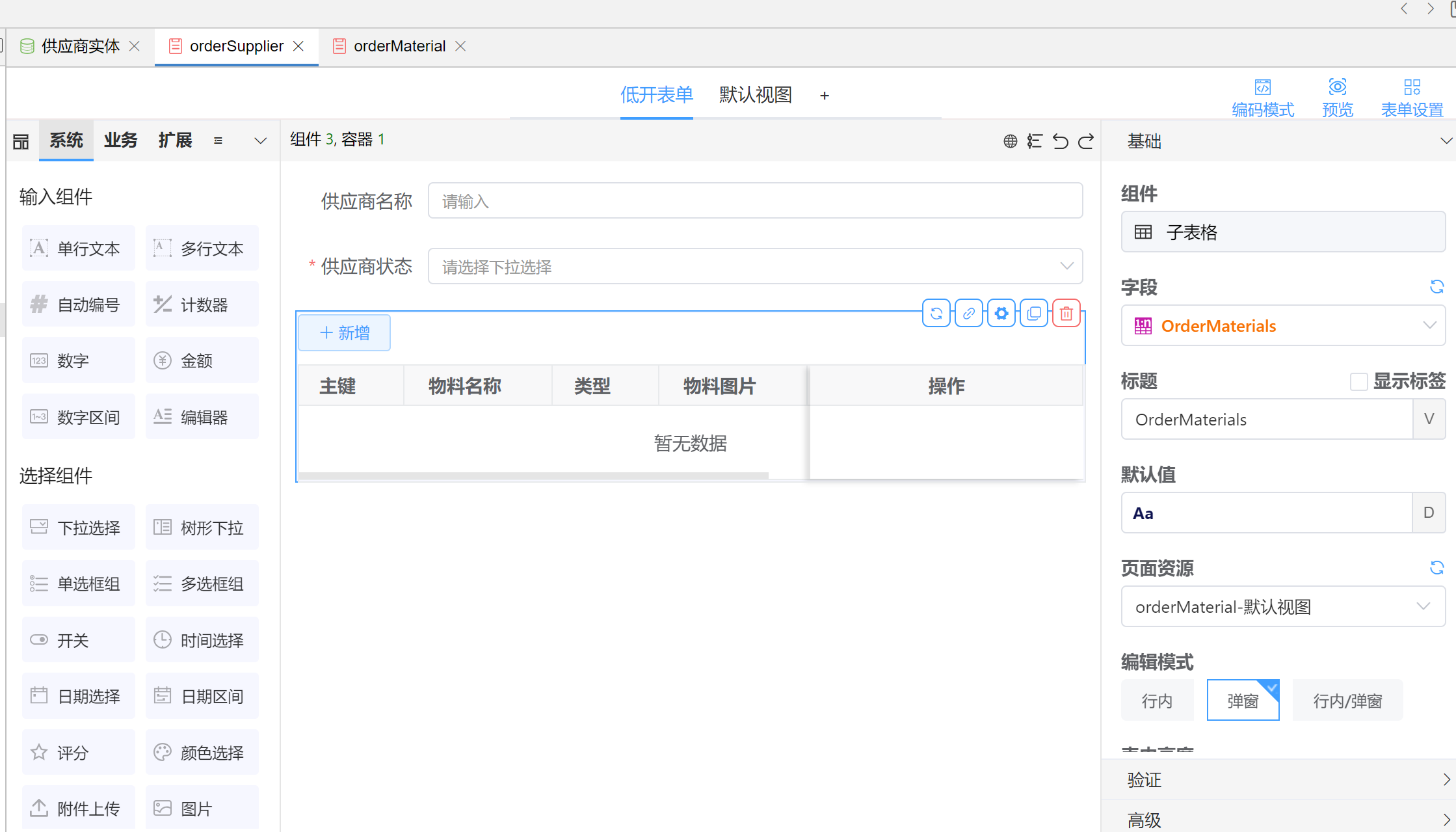 供应商中有物料子表格,在新增物料数据时,通过物料名称和物料类型进行检查该行数据是否已存在,如果存在,则进行提示“数据存在重复!”,如果不存在,则为其自动生成物料编码code。