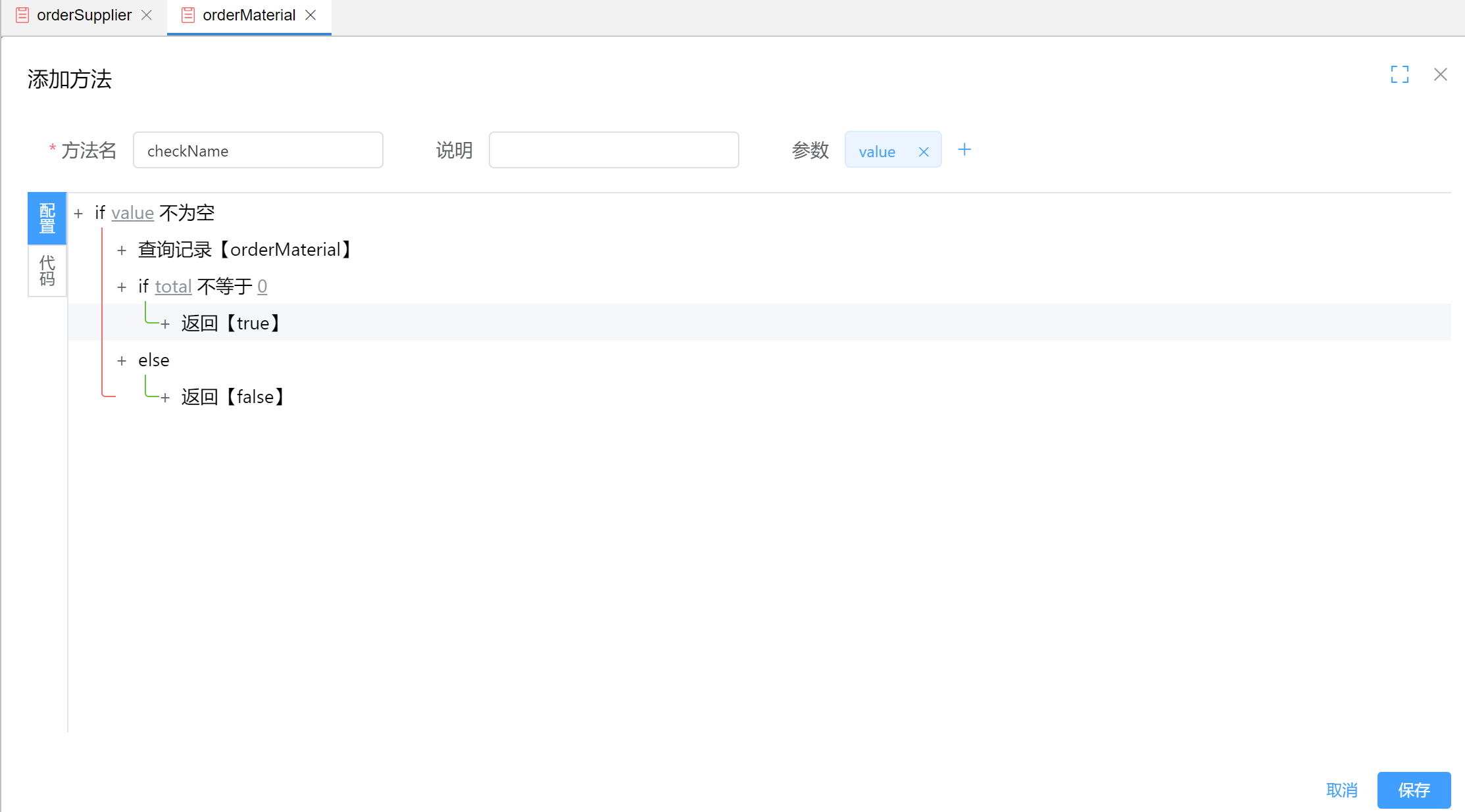 在物料表单-表单设置-高级设置-添加checkName方法,检查是否存在符合特定条件的物料数据。 在此以通过物料编码code和物料类型materialType为例进行查询数据: