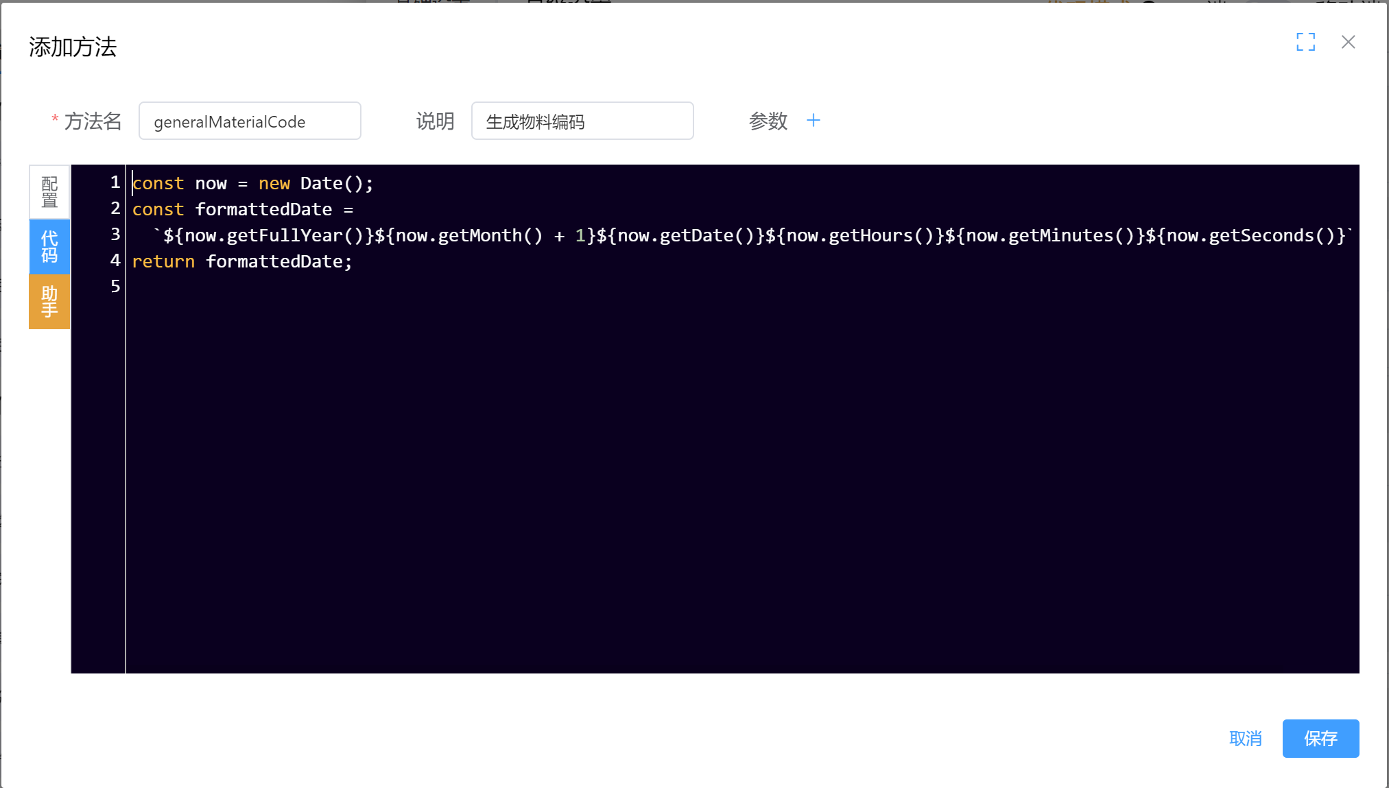 在物料表单-表单设置-高级设置-添加generalMaterialCode方法,将当前的日期和时间格式化为一个连续的字符串,并返回这个字符串,用于生成物料编码code: