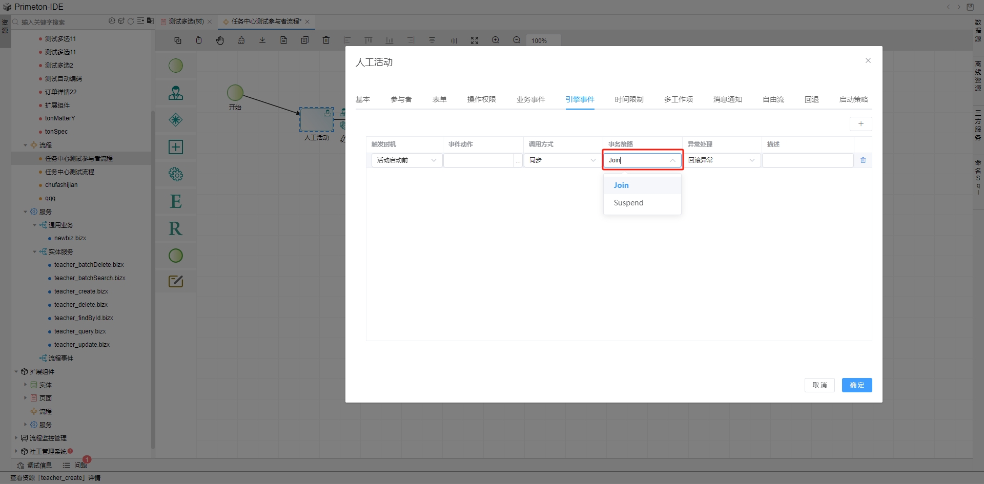 业务流程引擎触发事件动作时有两种事务策略,Suspend和Join。