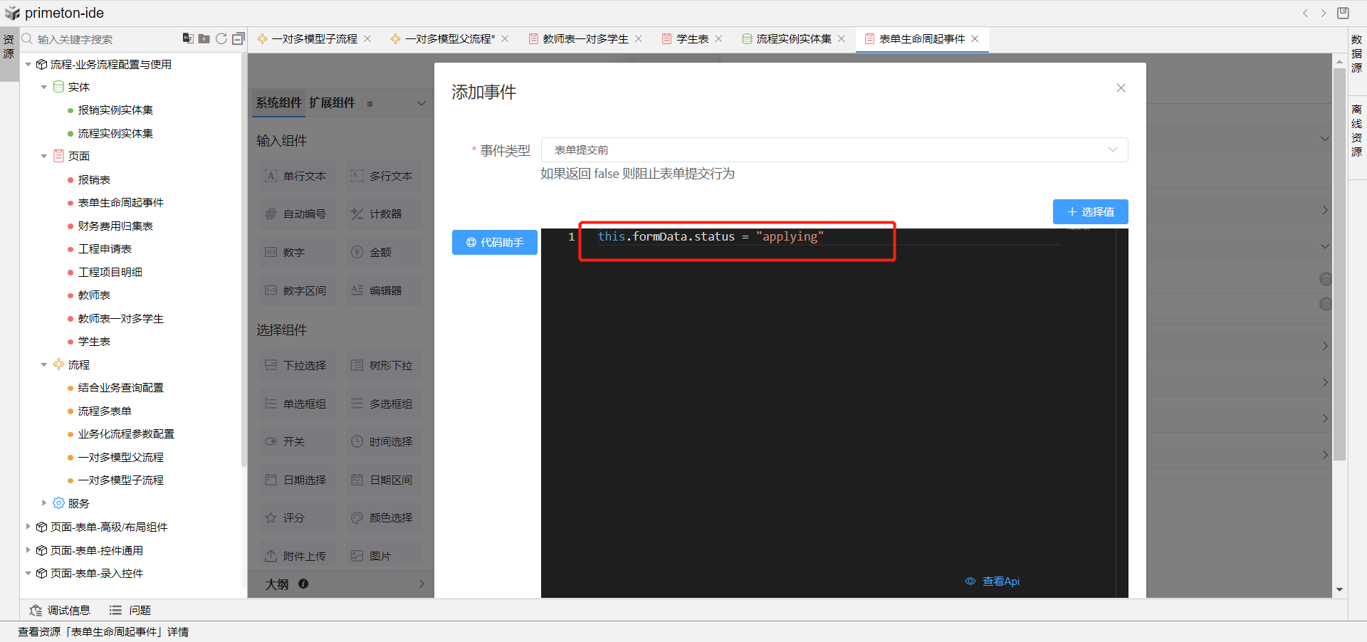 事件类型为事件的触发时机或条件;事件类型有表单加载前、表单查询前、表单查询后、表单加载后、表单提交前、表单提交成功后、流程提交;可以选择相应的事件添加代码触发;