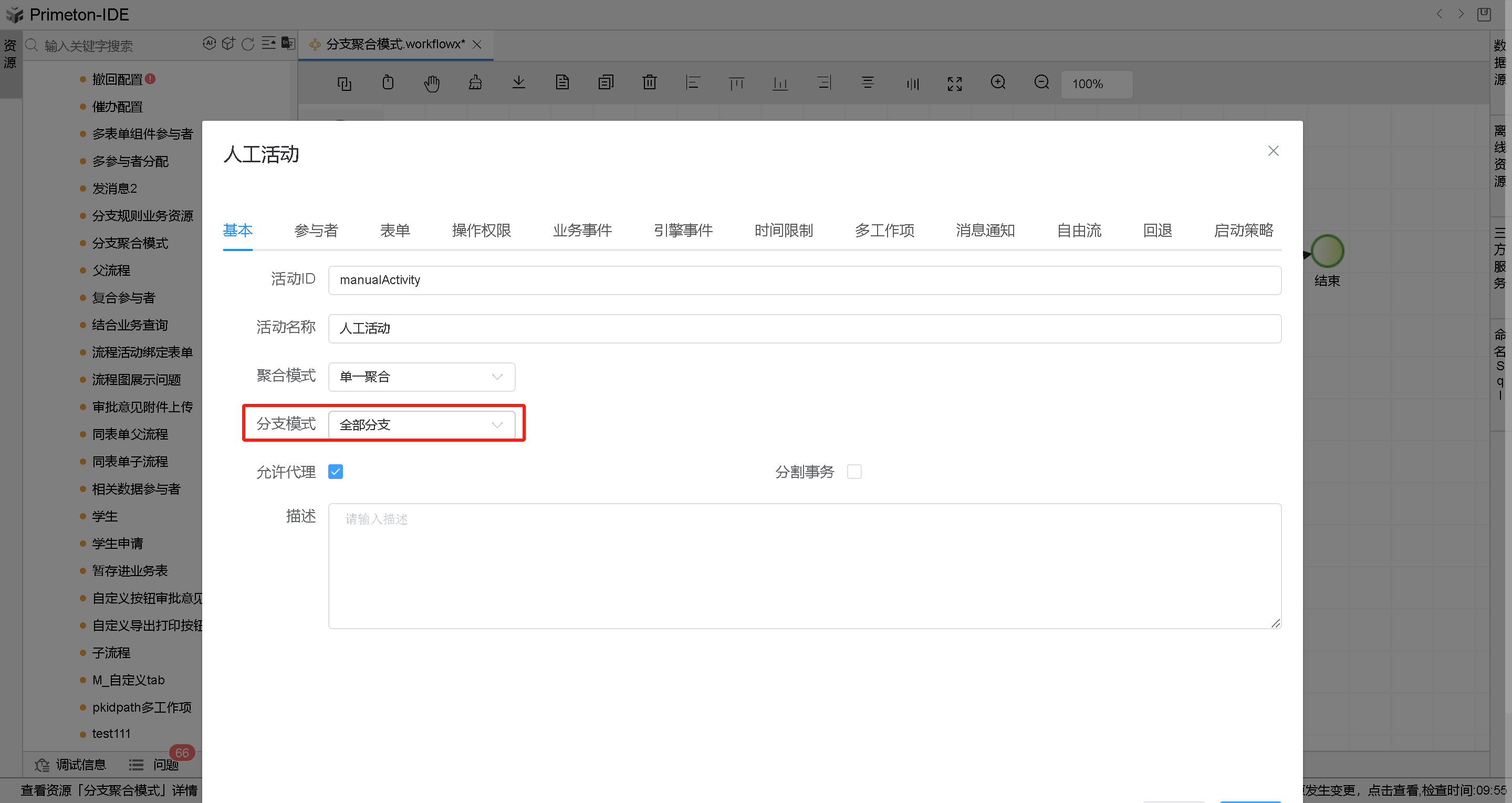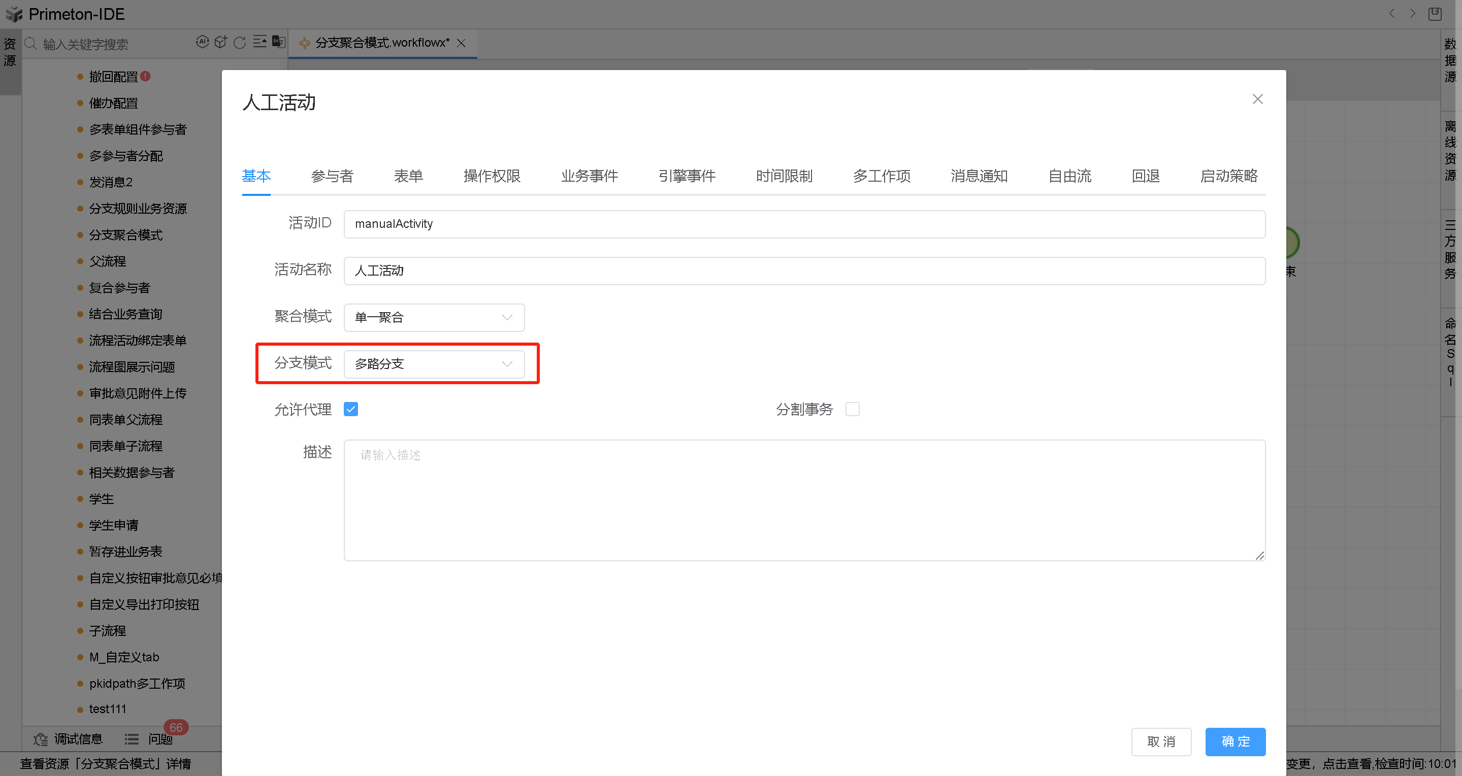 分支模式,表示该活动结束后,它的后继活动的触发情况。它包括"全部分支(AND)"、"单一分支(XOR)"以及"多路分支(OR)"三种情况。
