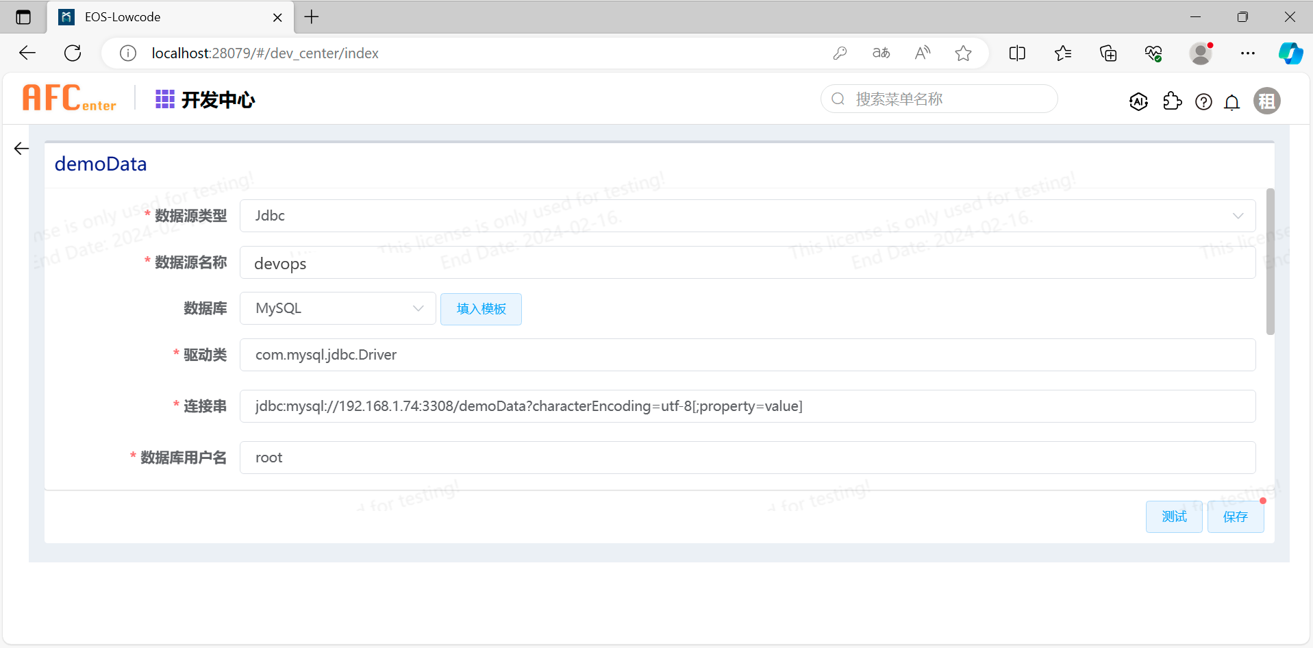 在新建的测试数据集中,选择创建的数据源,填写其他相关信息,具体开发详解请参考数据集配置 (opens new window)。