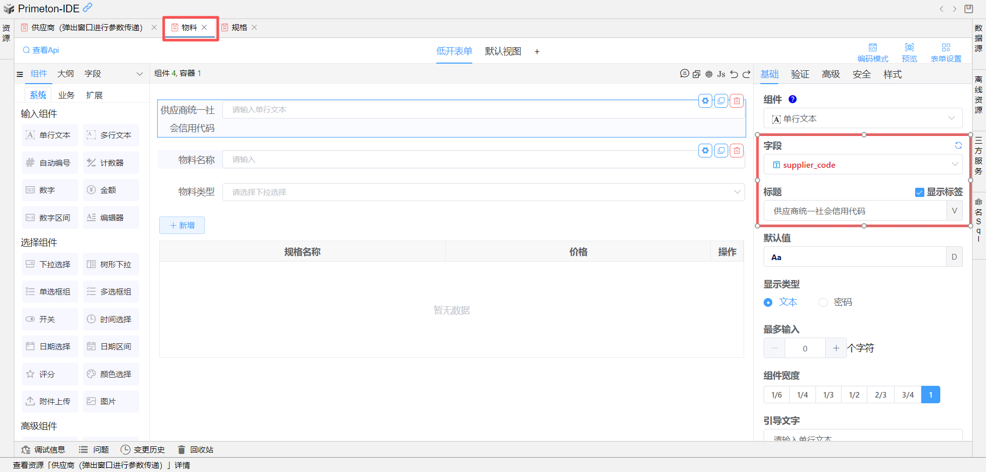 formdata_supplier_code设置为规格表单的供应商统一社会信用代码组件的默认值。![]()