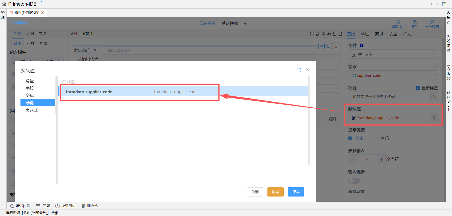 formdata_supplier_code设置为物料表单的供应商统一社会信用代码组件的默认值。![]()