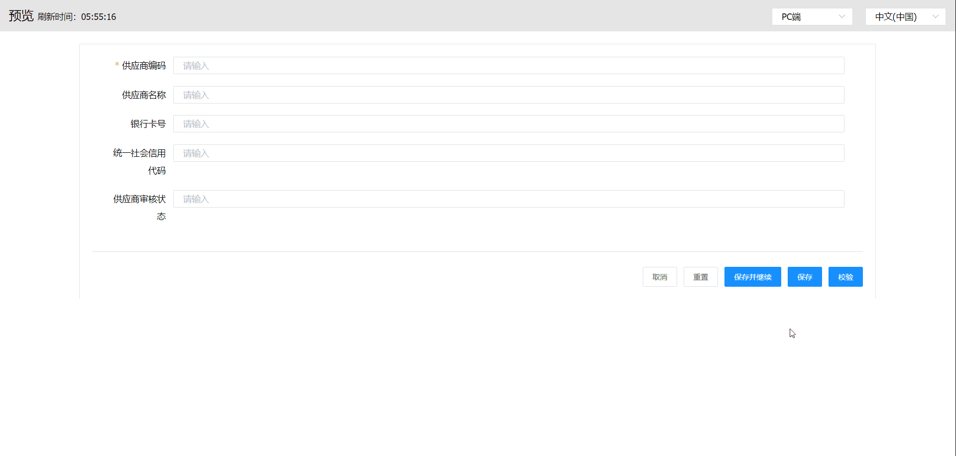 在供应商表单中添加自定义按钮,在按钮的代码块中调用表单校验接口,对表单进行校验。