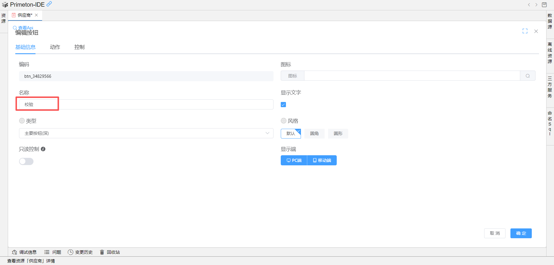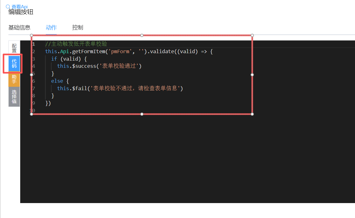 对自定义按钮进行编辑,名称改为“校验”,添加动作代码块,调用表单校验接口。