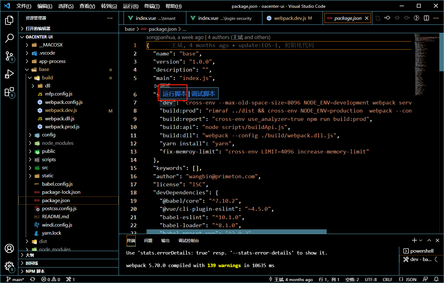 另一种是找到对应目录下的package.json文件,把鼠标放在对应的命令行上或右击,点击运行脚本'