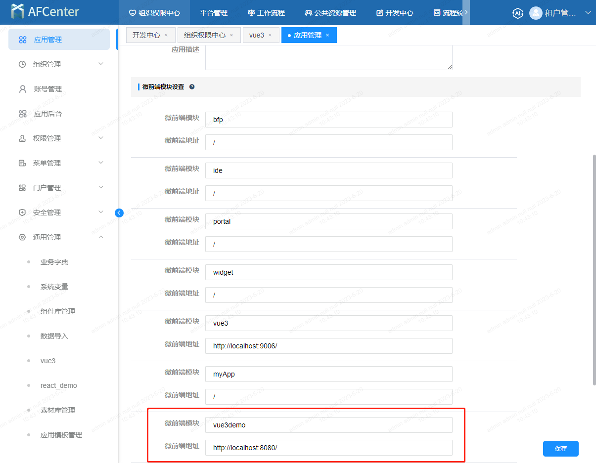 这里列举两个异构微前端页面挂载在afcenter菜单中展示的操作步骤,vue3和react类型项目。