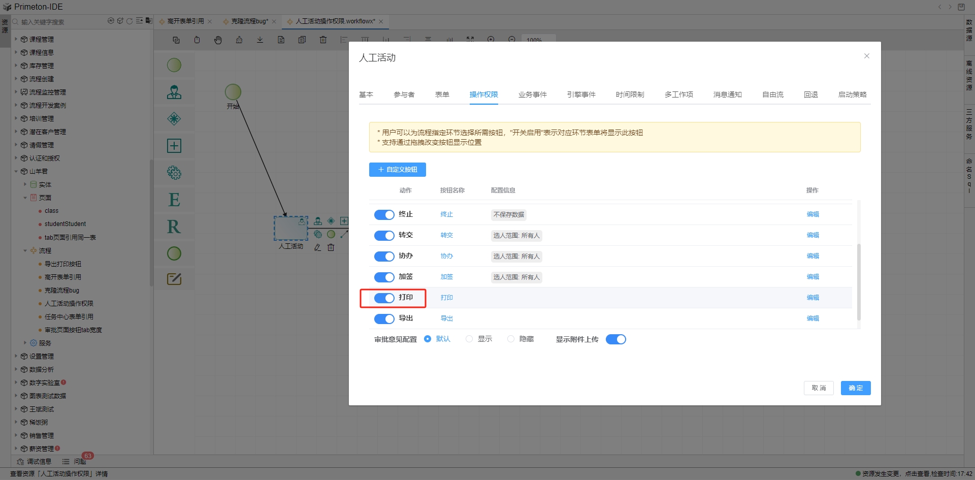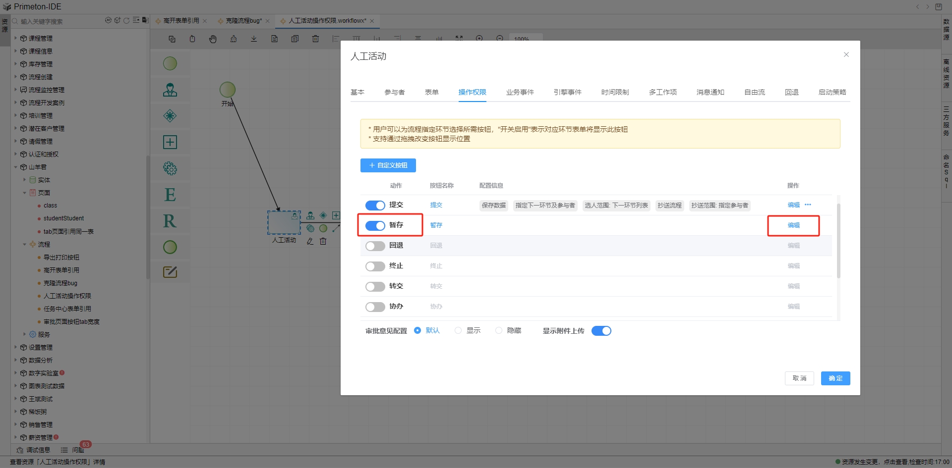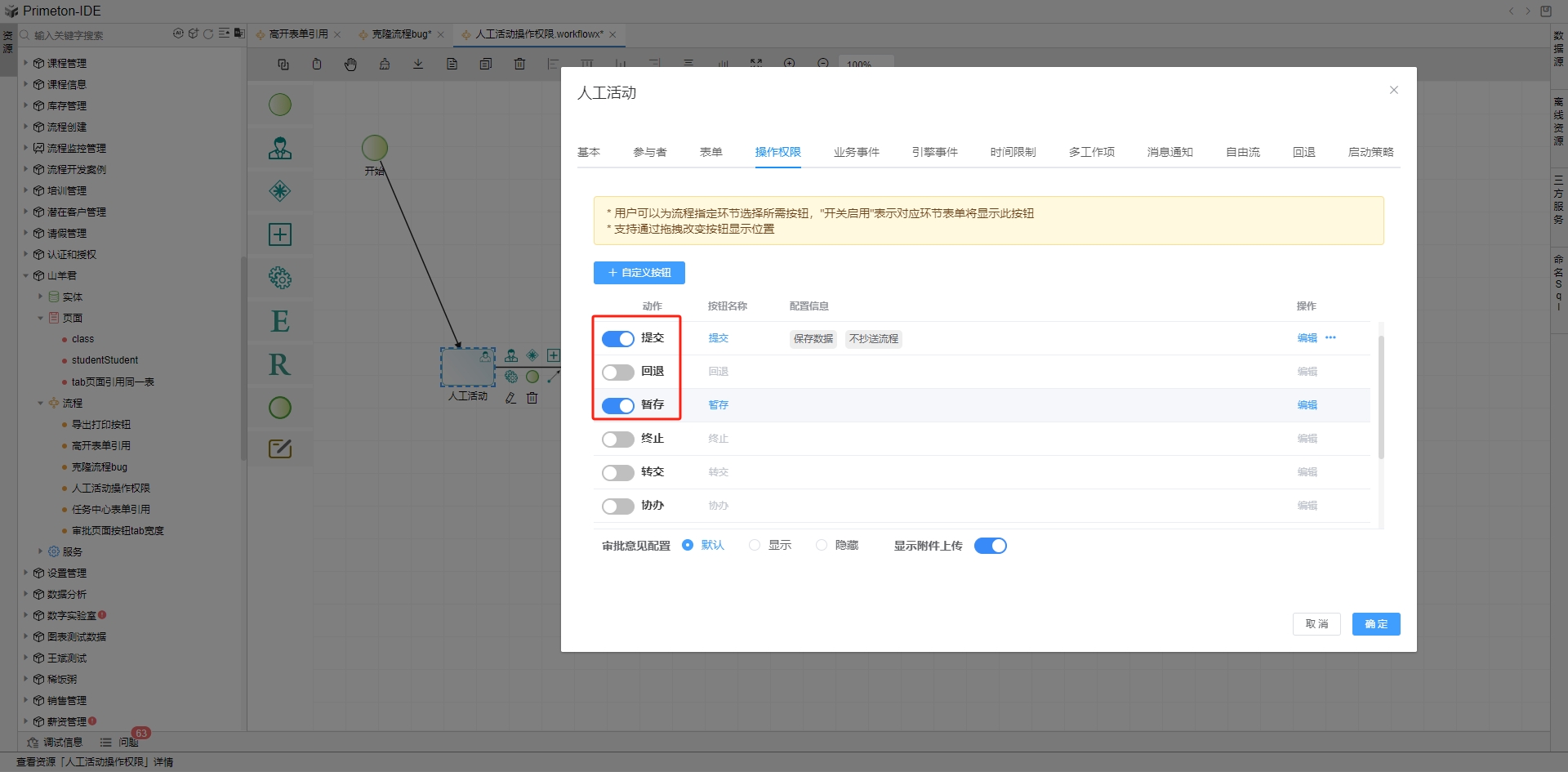 流程在运行过程中会有各种操作,如提交、暂存,回退、终止、转交、协办、加签、打印、导出等。根据每个活动图元特定的业务需求来设置操作权限。
