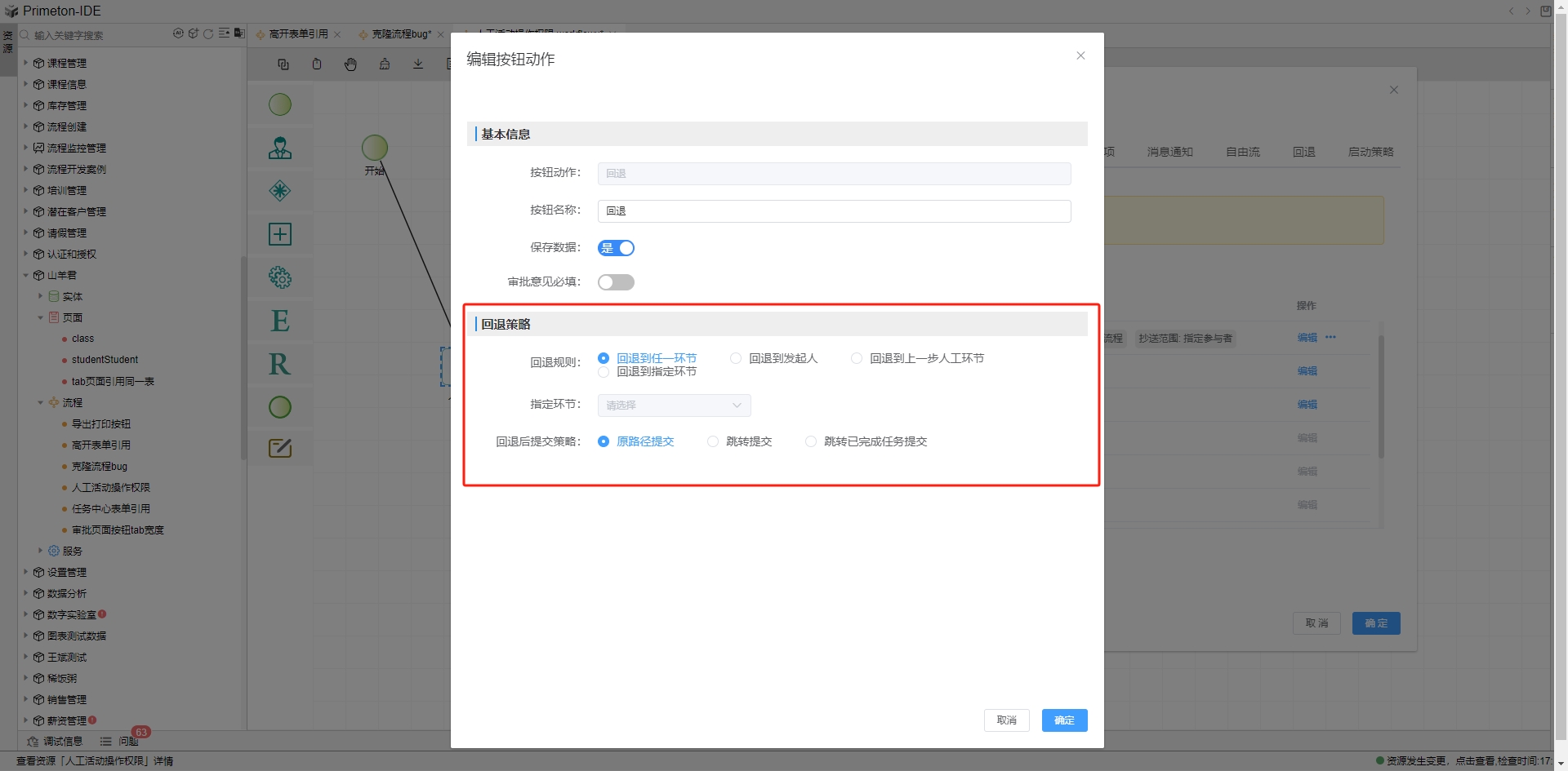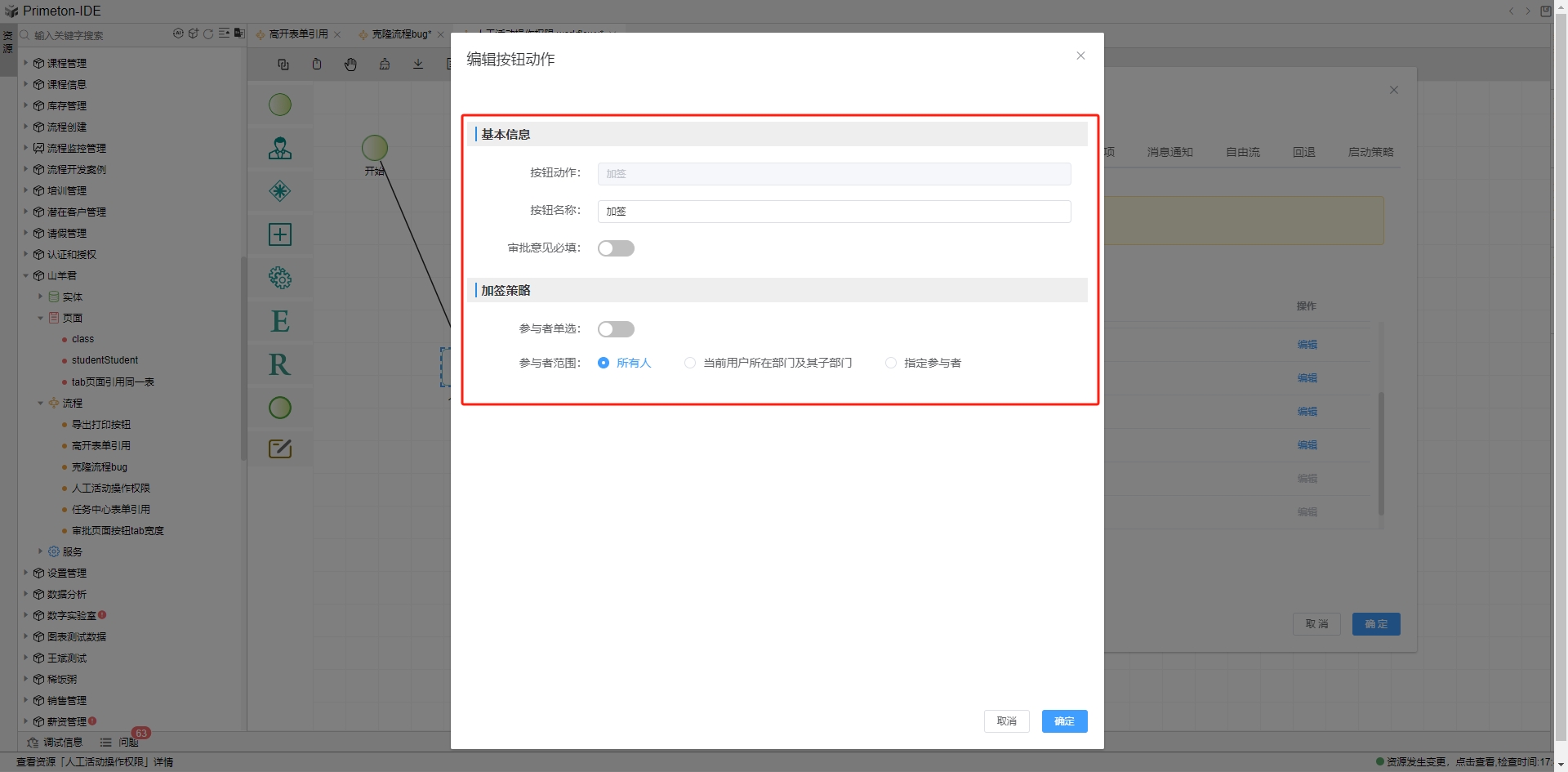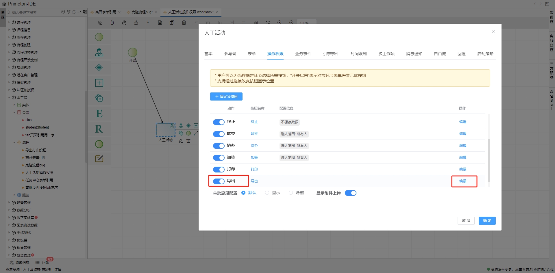 流程在运行过程中会有各种操作,如提交、暂存,回退、终止、转交、协办、加签、打印、导出等。根据每个活动图元特定的业务需求来设置操作权限。