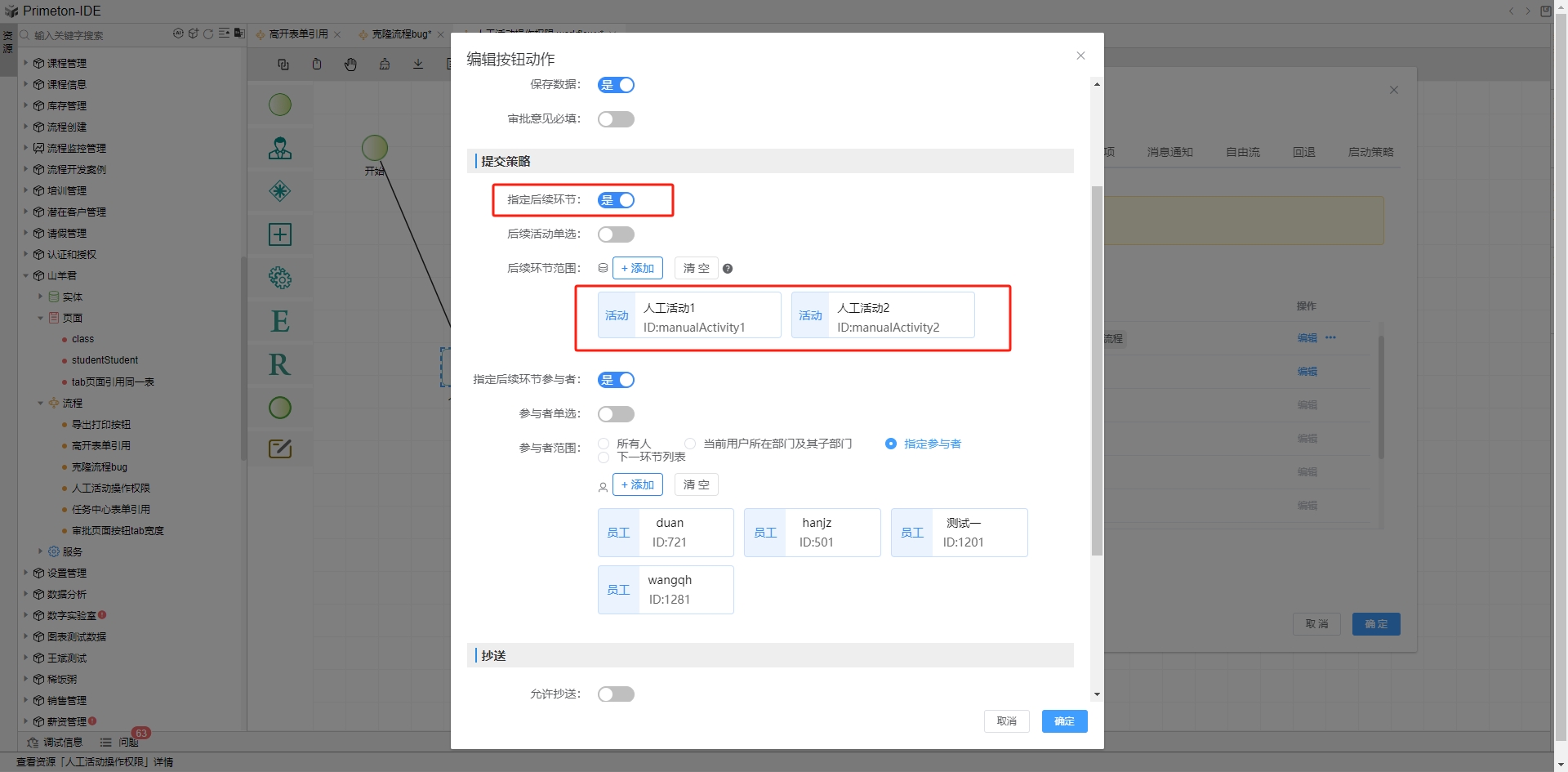 开启并添加后续环节范围后,在当前环节提交时,可以选择提交到后续指定环节中。