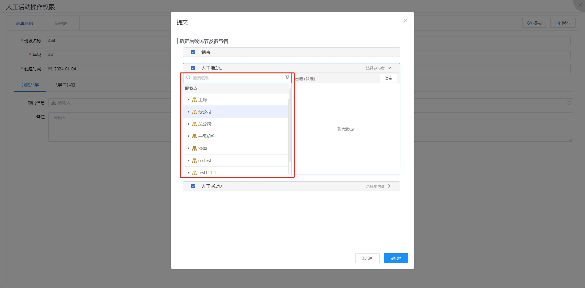 此时流程提交时,指定后续环节候选范围只展示人工活动1,如果需要同时展示所有指定后续环节,则需要配置自由流。