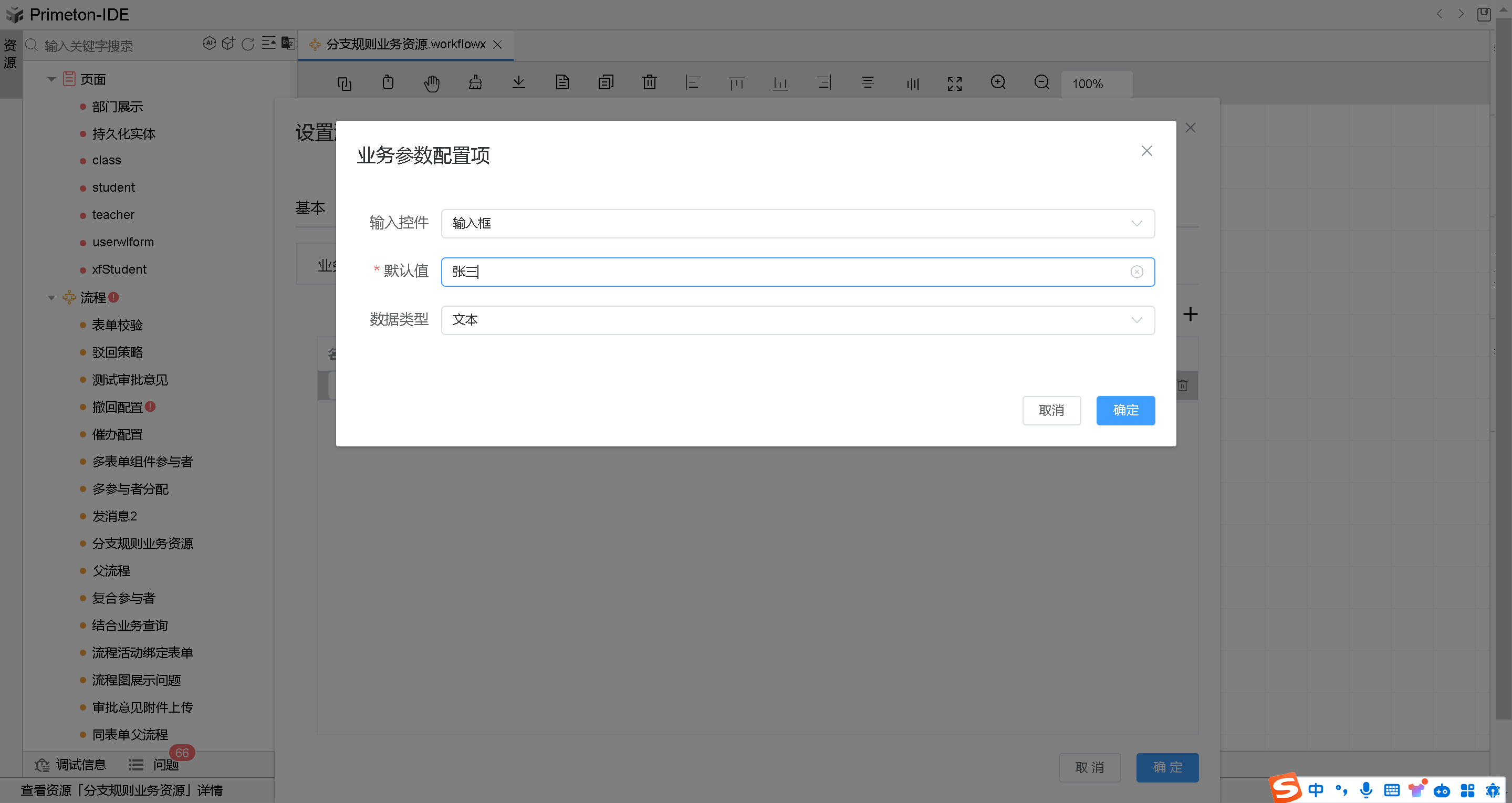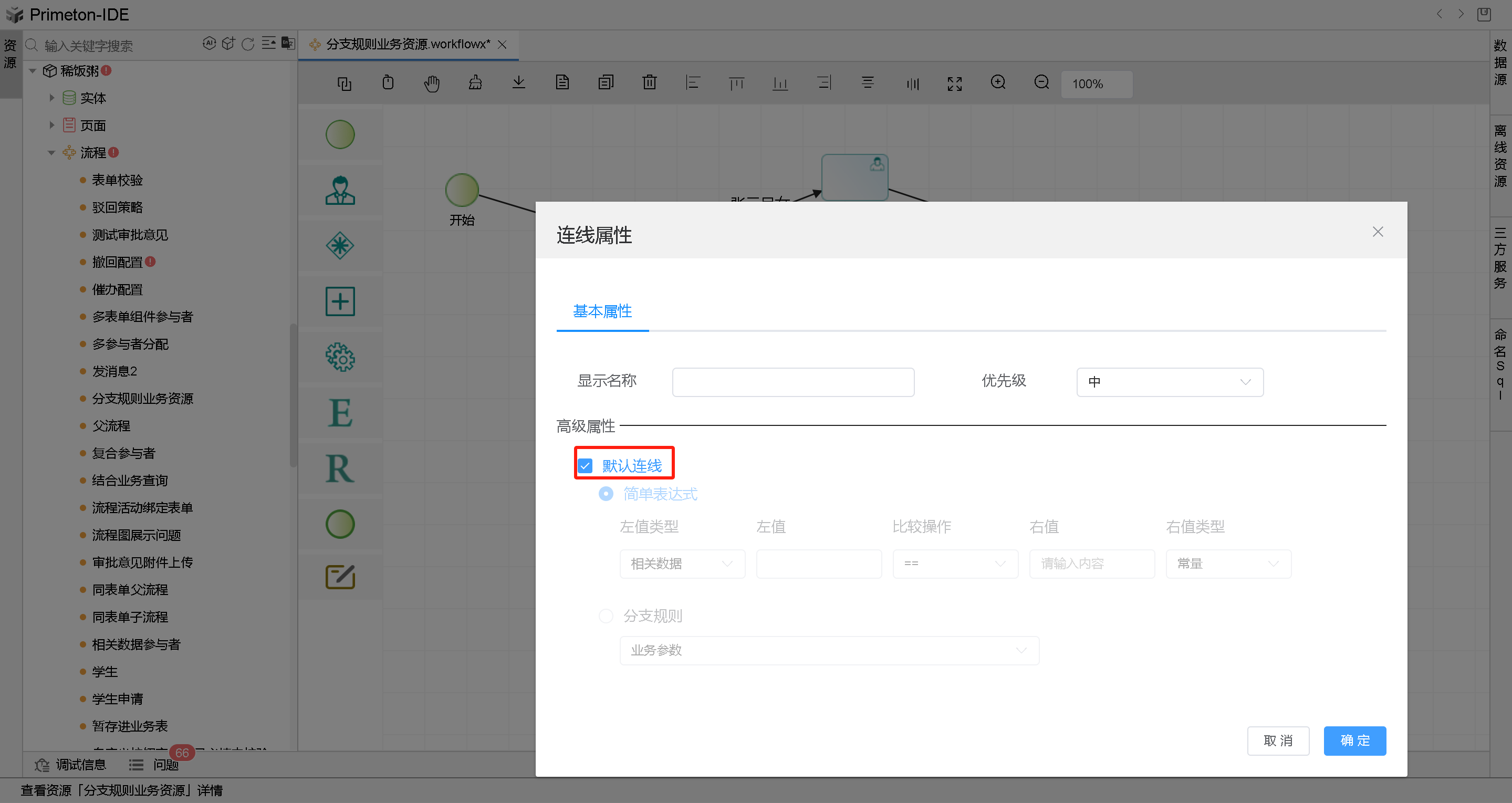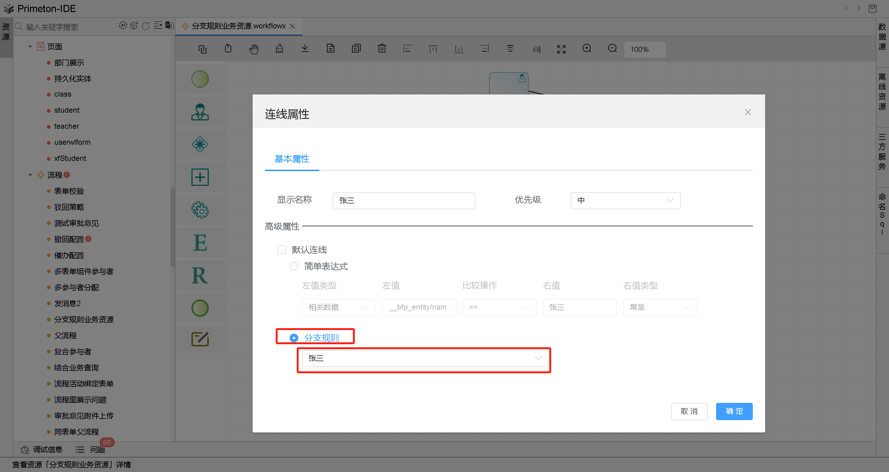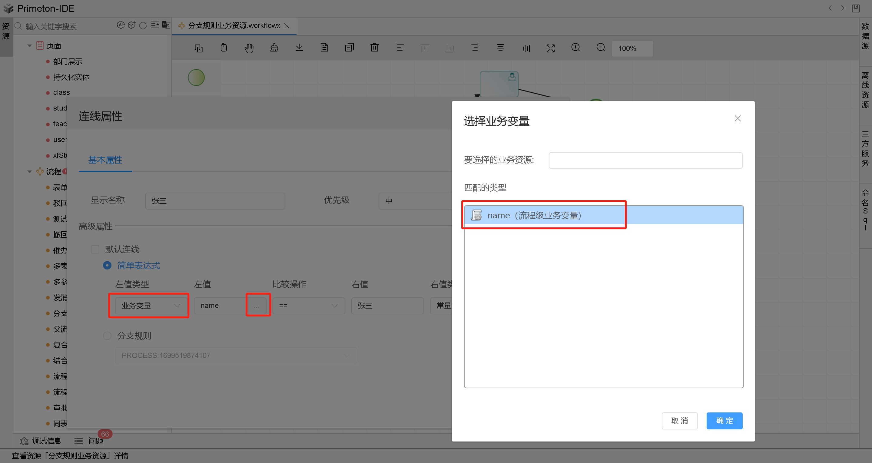 类型为业务资源时左值则可以点击选择表单实体的业务属性。如下取流程绑定的表单实体中name属性值,即在流程环节到分支时根据name属性值是否为张三来决定走哪个分支。