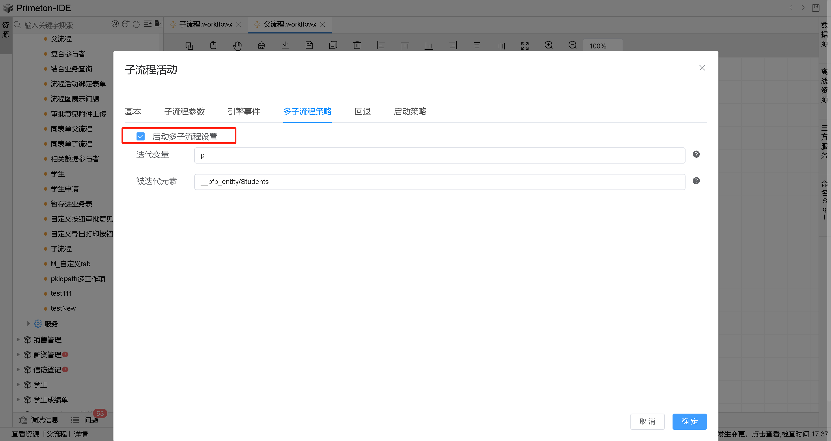 • 发起父流程,当激活子流程活动实例时根据主流程表单中__bfp_entity/Students数组长度循环遍历生成对应个数的子流程实例。