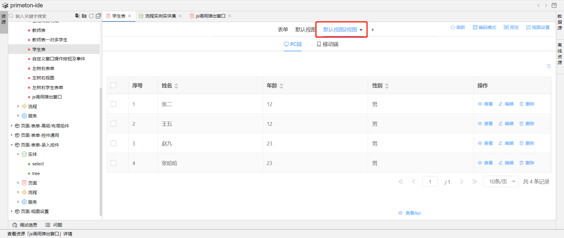 1.在学生表单中新建一个学生默认视图2,打开视图设置,点击表格设置中多选设置,切换为多选模式。