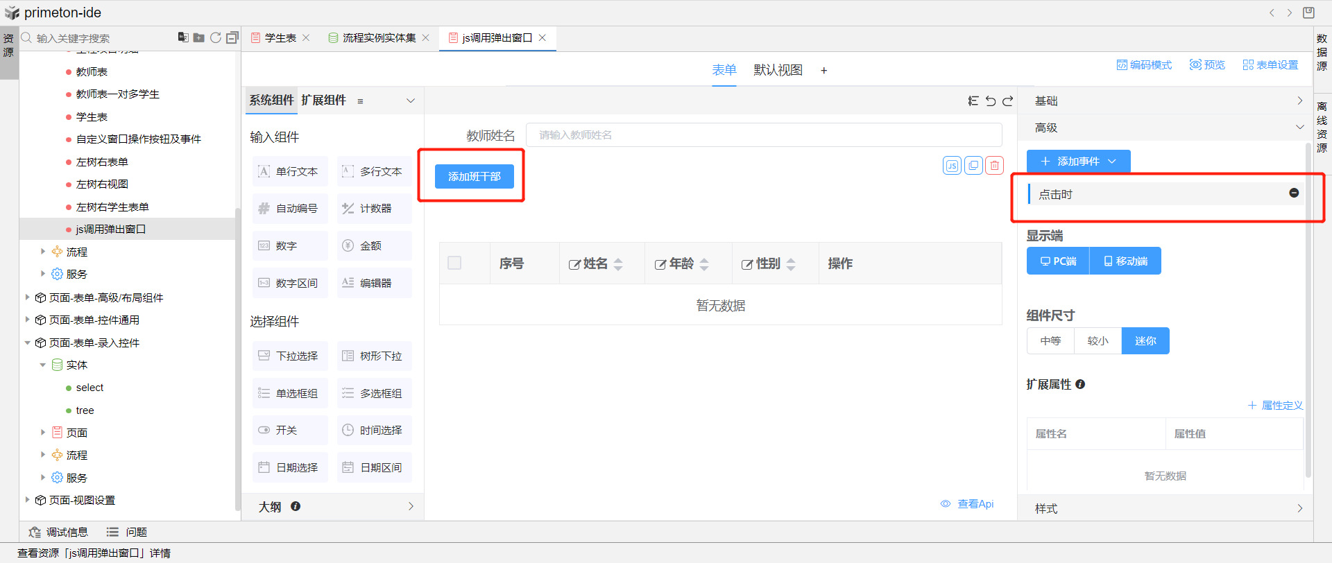 3.在子表格组件上方拖入一个按钮组件放入,按钮文字修改为添加班干部,选择按钮高级属性,添加按钮点击时事件,打开点击时事件设置弹窗,动作选择打开窗口,修改标题为选择学生,资源绑定刚刚创建的学生信息视图,在回调函数中写入如下js代码,即可在打开的选择学生信息列表选择后关闭弹窗将信息回填至表单子表格中。
